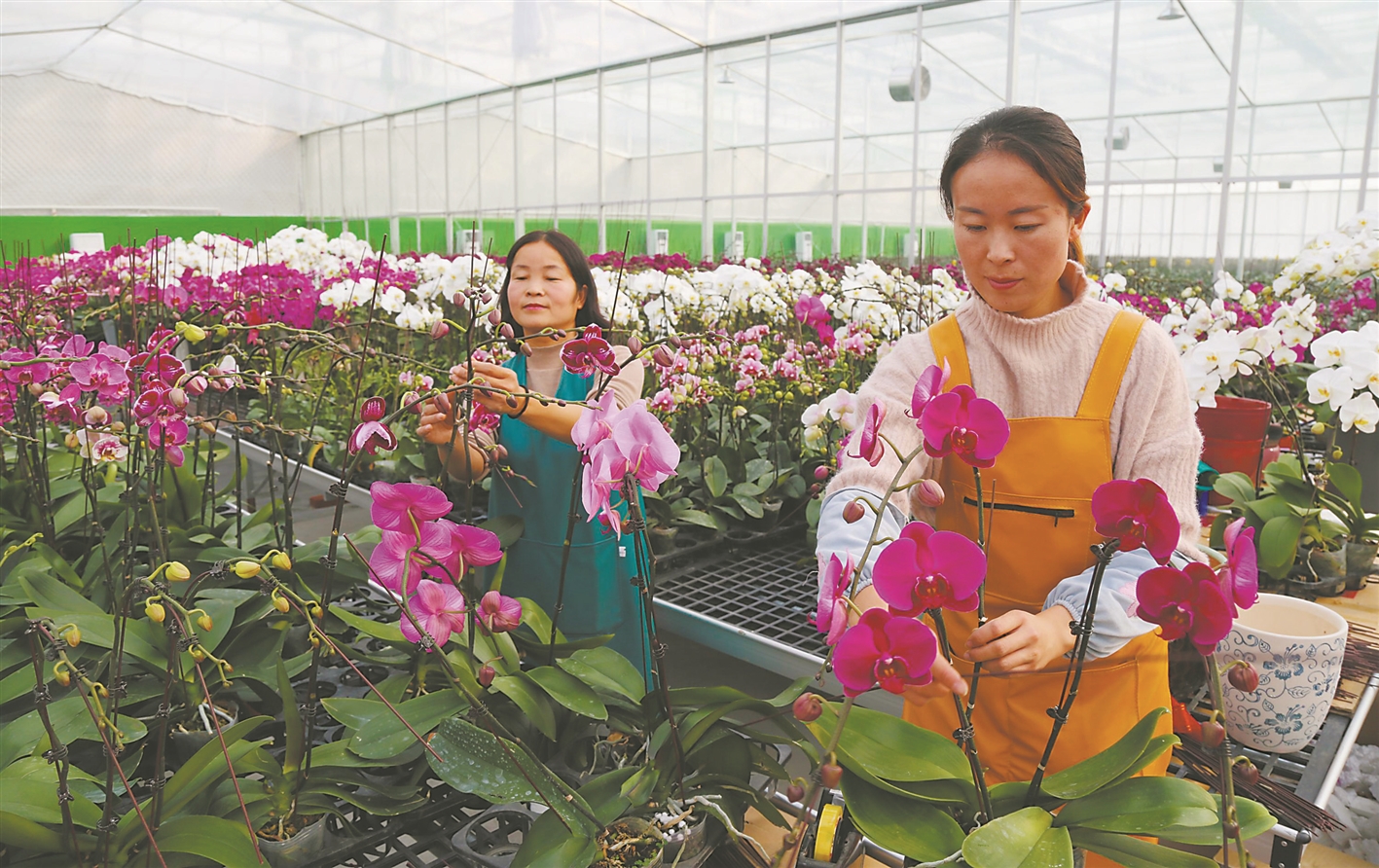 日前,在颍上县南照镇姚岗村安徽省十步青山蝴蝶兰花种植示范园里,工人们在给6万多株蝴蝶兰塑型。该园采用“公司+基地+农户”的模式,通过流转土地、资金入股等方式,带动周边34名贫困群众脱贫增收。本报通讯员 王林洪 摄