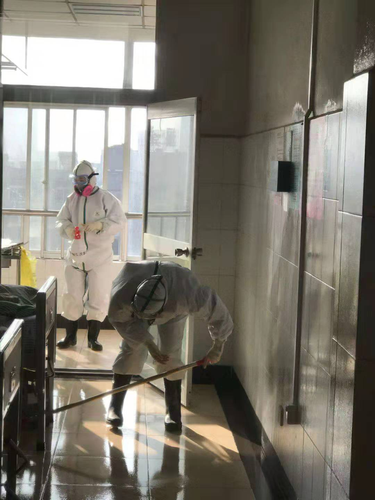 同事们在给病房打扫消毒