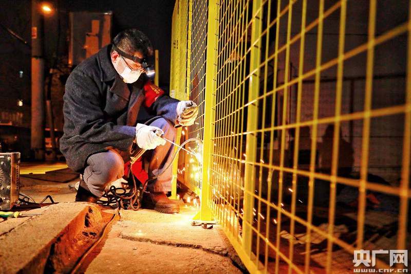 工人们连夜为西园新村小区出入口焊接钢网(央广网发 合肥市蜀山区委宣传部供图)