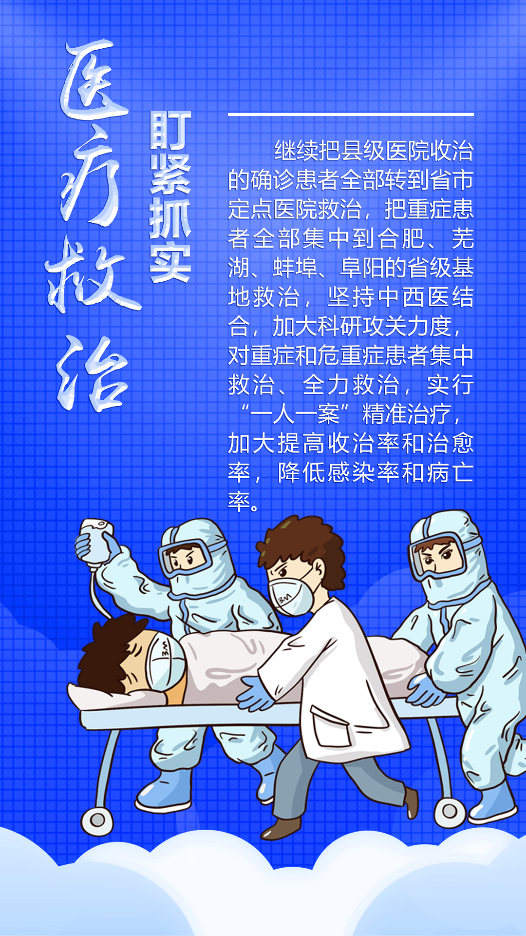 继续把县级医院收治的确诊患者全部转到省市定点医院救治,把重症患者全部集中到合肥、芜湖、蚌埠、阜阳的省级基地救治,坚持中西医结合,加大科研攻关力度,对重症和危重症患者集中救治、全力救治,实行“一人一案”精准治疗,加大提高收治率和治愈率,降低感染率和病亡率。