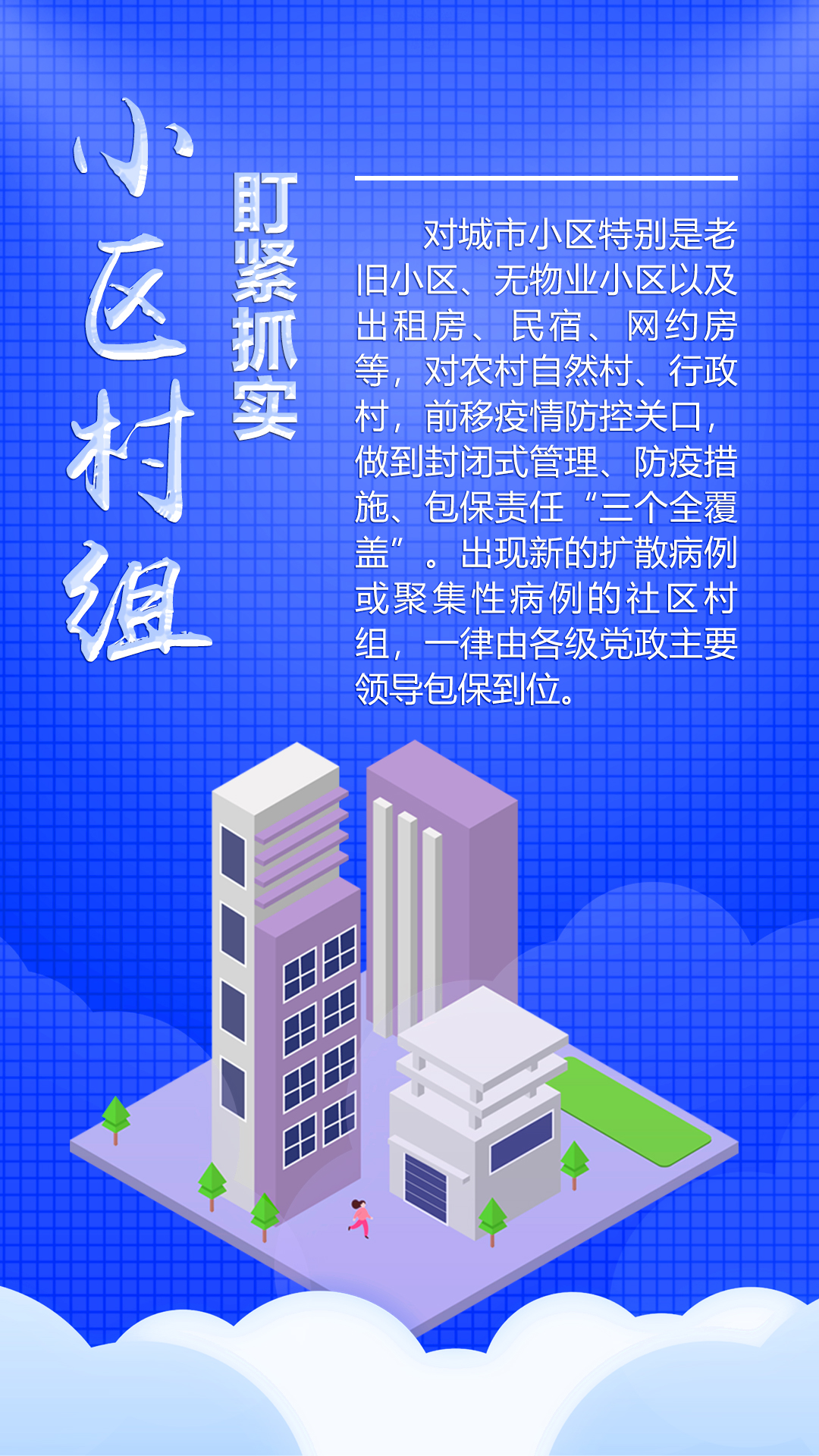 对城市小区特别是老旧小区、无物业小区以及出租房、民宿、网约房等,对农村自然村、行政村,前移疫情防控关口,做到封闭式管理、防疫措施、包保责任“三个全覆盖”。出现新的扩散病例或聚集性病例的社区村组,一律由各级党政主要领导包保到位。