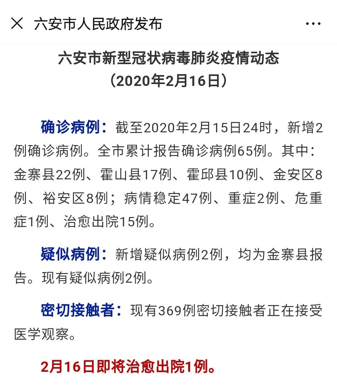 确诊病例:截至2020年2月15日24时,新增2例确诊病例。全市累计报告确诊病例65例。其中:金寨县22例、霍山县17例、霍邱县10例、金安区8例、裕安区8例;病情稳定47例、重症2例、危重症1例、治愈出院15例。