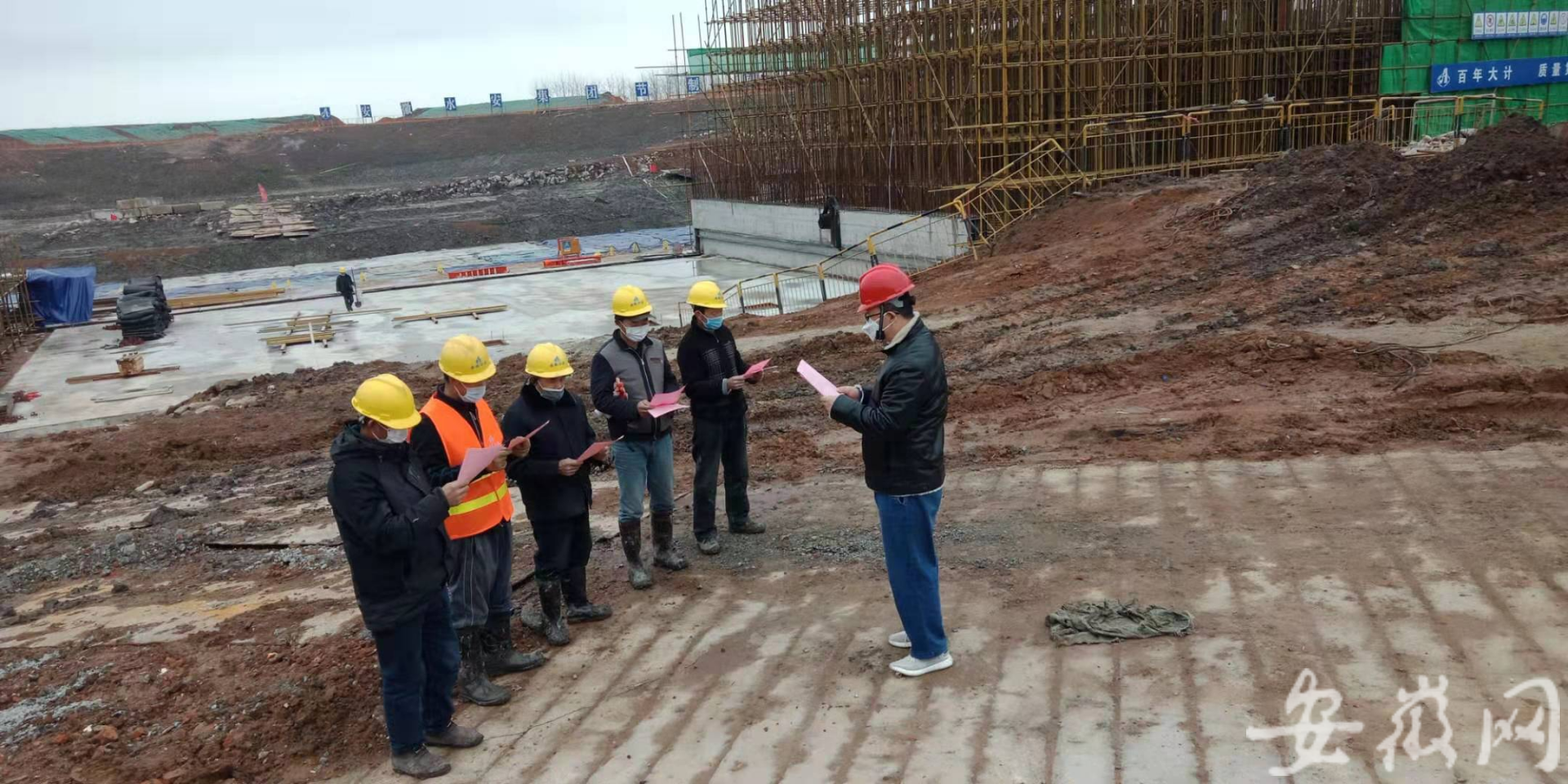 2月16日早晨,周师傅戴好口罩,经过测体温等程序后,进入引江济淮工程枞阳枢纽节制闸的施工现场。佩戴口罩、测量体温,这已是半个多月来,该工程现场每天开工的第一道程序。