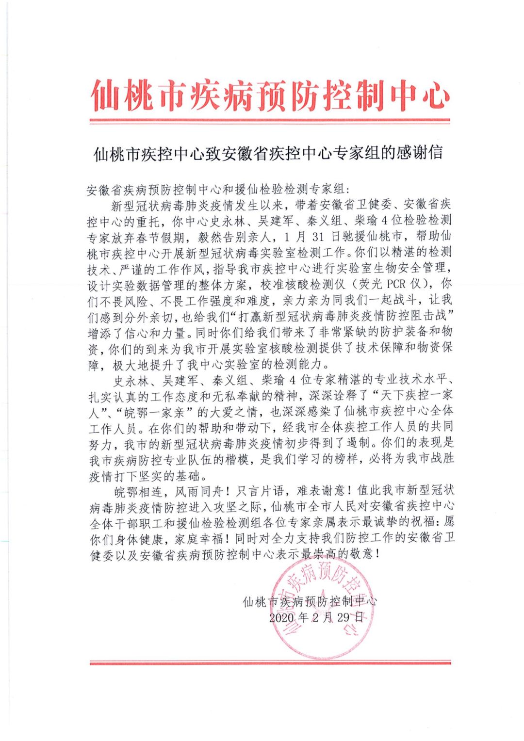 史永林、吴建军、秦义组、柴瑜4位专家精湛的专业技术水平、扎实认真的工作态度和无私奉献的精神,深深诠释了“天下疾控一家人”“皖鄂一家亲”的大爱之情,也深深感染了仙桃市疾控中心全体工作人员。在你们的帮助和带动下,经我市全体疾控工作人员的共同努力,我市的新型冠状病毒肺炎疫情初步得到了遏制。你们的表现是我市疾病防控专业队伍的楷模,是我们学习的榜样,必将为我市战胜疫情打下坚实的基础。