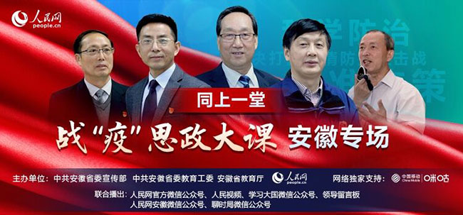 人民网合肥4月21日电(汪瑞华)疫情防控是一场没有硝烟的战争,更是一堂鲜活生动的思政大课。4月23日14:30,由中共安徽省委宣传部、中共安徽省委教育工委、安徽省教育厅与人民网联合举办的“同上一堂战‘疫’思政大课”安徽专场将“云端”开讲。