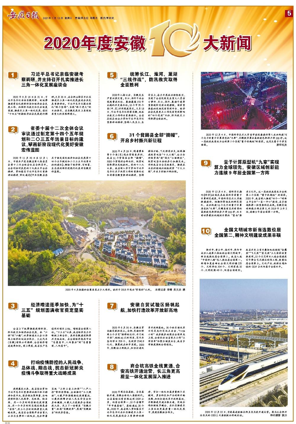 十大新闻是:习近平总书记亲临安徽考察调研,并主持召开扎实推进长三角一体化发展座谈会;省委十届十二次全体会议审议通过制定第十四个五年规划和二三五年远景目标的建议,擘画新阶段现代化美好安徽宏伟蓝图;经济增速逐季加快,为“十三五”规划圆满收官奠定坚实基础;打响疫情防控的人民战争、总体战、阻击战,抗击新冠肺炎疫情斗争取得重大战略成果;统筹长江、淮河、巢湖“三线作战”,防汛救灾取得全面胜利;31个贫困县全部“摘帽”,开启乡村振兴新征程;安徽自贸试验区扬帆起航,加快打造改革开放新高地;商合杭高铁全线贯通、合安高铁开通运营,长三角更高质量一体化发展深入推进;量子计算原型机“九章”实现算力全球领先,安徽区域创新能力连续9年居全国第一方阵;全国文明城市新当选数位居全国第二,精神文明建设成果丰硕。