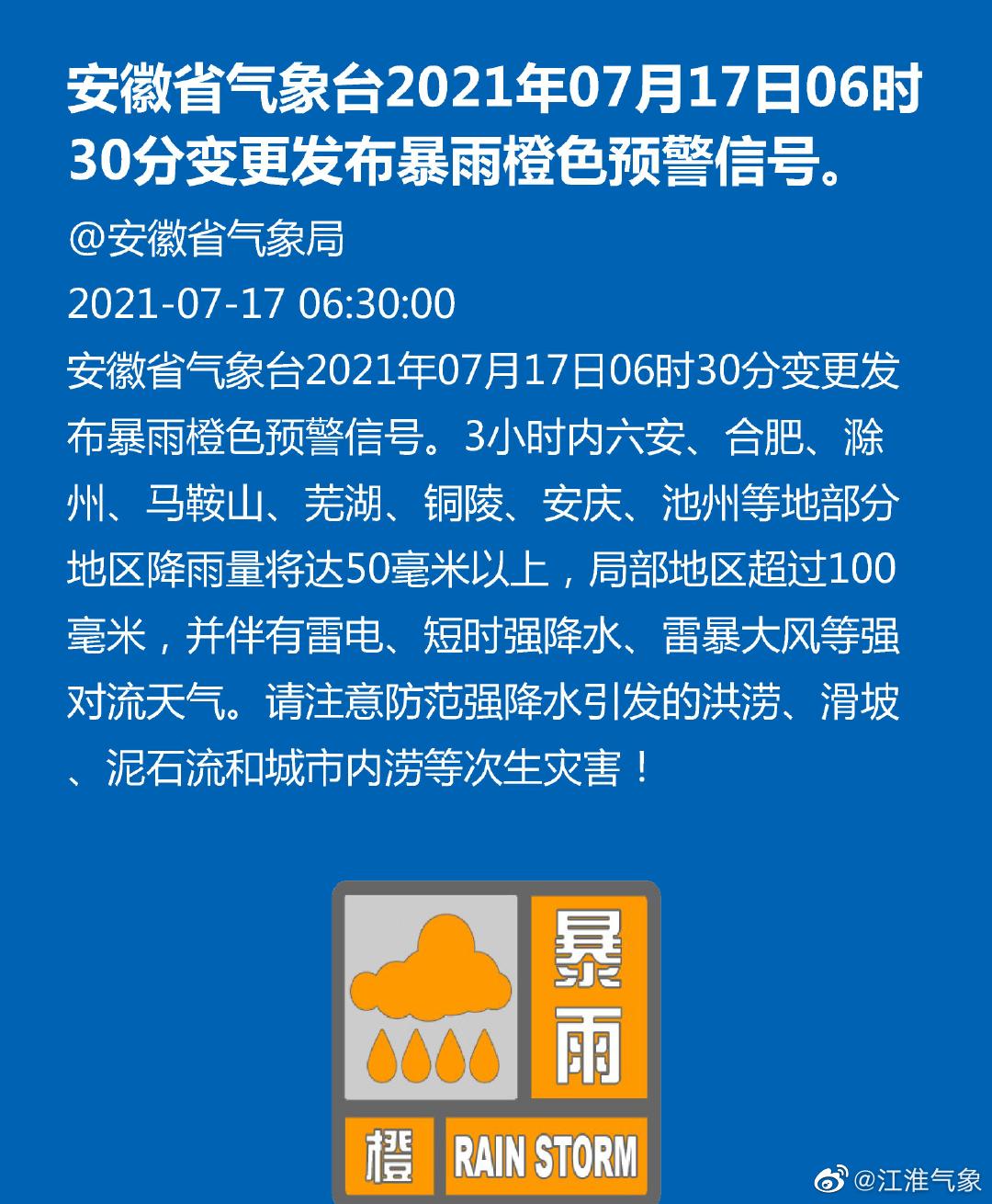 安徽省气象台7月17日6时30分变更发布暴雨橙色预警信号。3小时内六安、合肥、滁州、马鞍山、芜湖、铜陵、安庆、池州等地部分地区降雨量将达50毫米以上,局部地区超过100毫米,并伴有短时强降水、雷电、雷暴大风等强对流天气。
