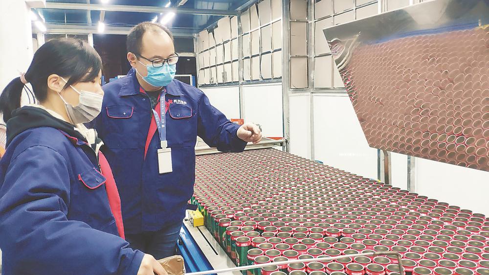 位于滁州市琅琊经济技术开发区的昇兴包装有限公司生产车间里,厂长邓昕光(右)正在流水线上检查生产情况。邓昕光是湖南邵阳人,今年春节,他选择“就地过年”,带领120多名员工加班生产。 本报记者 周连山 本报通讯员 李晓村 摄