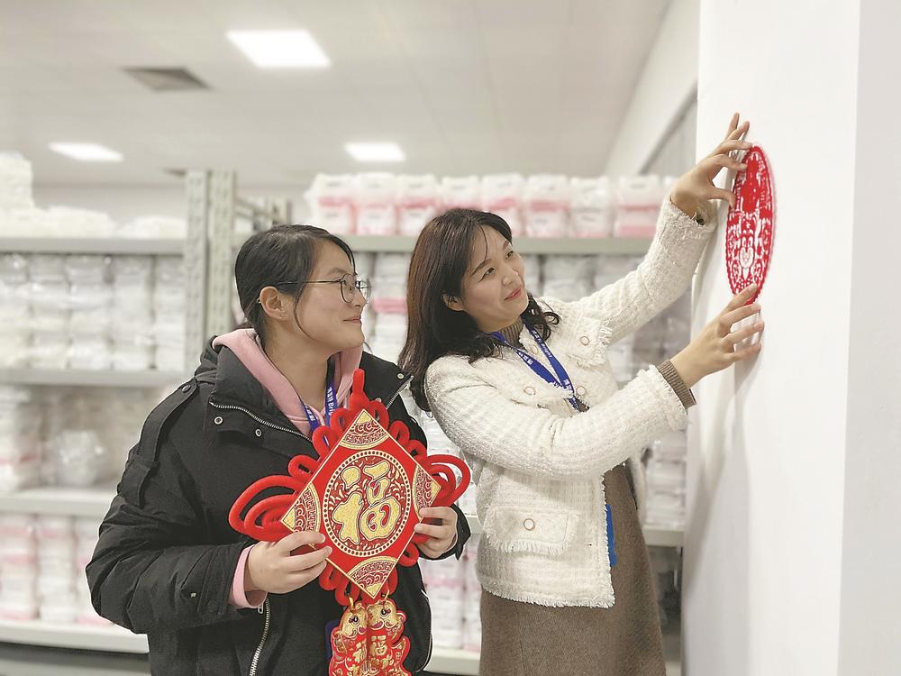 老家在江苏的质检工程师李洁(右)选择在黄山屯溪“就地过年”。图为李洁和同事一起贴对联、粘窗花。 本报记者 潘成 本报通讯员 王珊 摄
