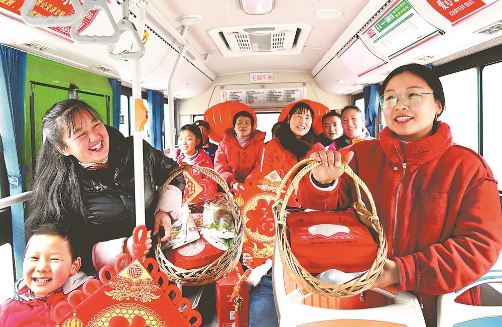 1月27日,金寨县花石乡大湾村村民从集市上购买年货乘坐通村公交车返家。近年来,六安市积极改善群众出行条件,打通农村公路“最后一公里”。全市7个县区、130个乡镇、1810个建制村均开通了公交车,广大农民在家门口就能乘坐公交车进城赶集购物。特约摄影 陈力 摄