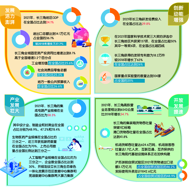 从投资到进出口,再到工业、消费和财政收入,这些指标都反映了2021年长三角经济发展的平稳向好态势,也彰显了长三角在全国发展大局中的重要地位。