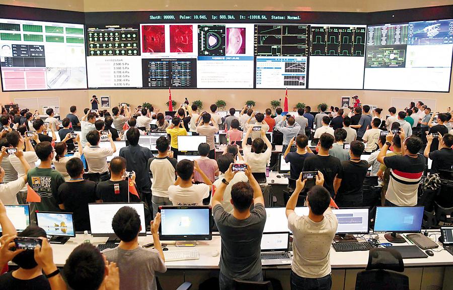 2021年 6月 8日下午,在中科院合肥物质科学研究院等离子体所,科研工作者共同见证了全超导托卡马克核聚变实验装置东方超环(EAST)完成第10万次放电。记者 徐旻昊 摄