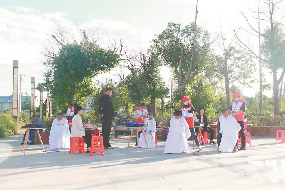 村部前,几把椅子一字排开,村民们依次坐上,志愿者根据他们的要求,干净利索地修剪出不同发型。半天下来,每位志愿者要服务十多位群众。在一些村庄,村干部还端来一盆盆热水,为理过发的村民洗头。理发过程中,志愿者和村民们一边唠着家常,一边宣讲卫生知识。