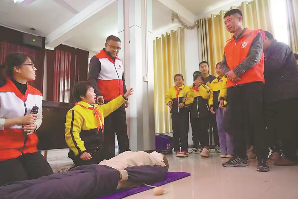 灵璧县红十字志愿服务队的志愿者在娄庄镇黄圩小学讲授急救知识。(资料图片)本栏图片均由灵璧县红十字会供图