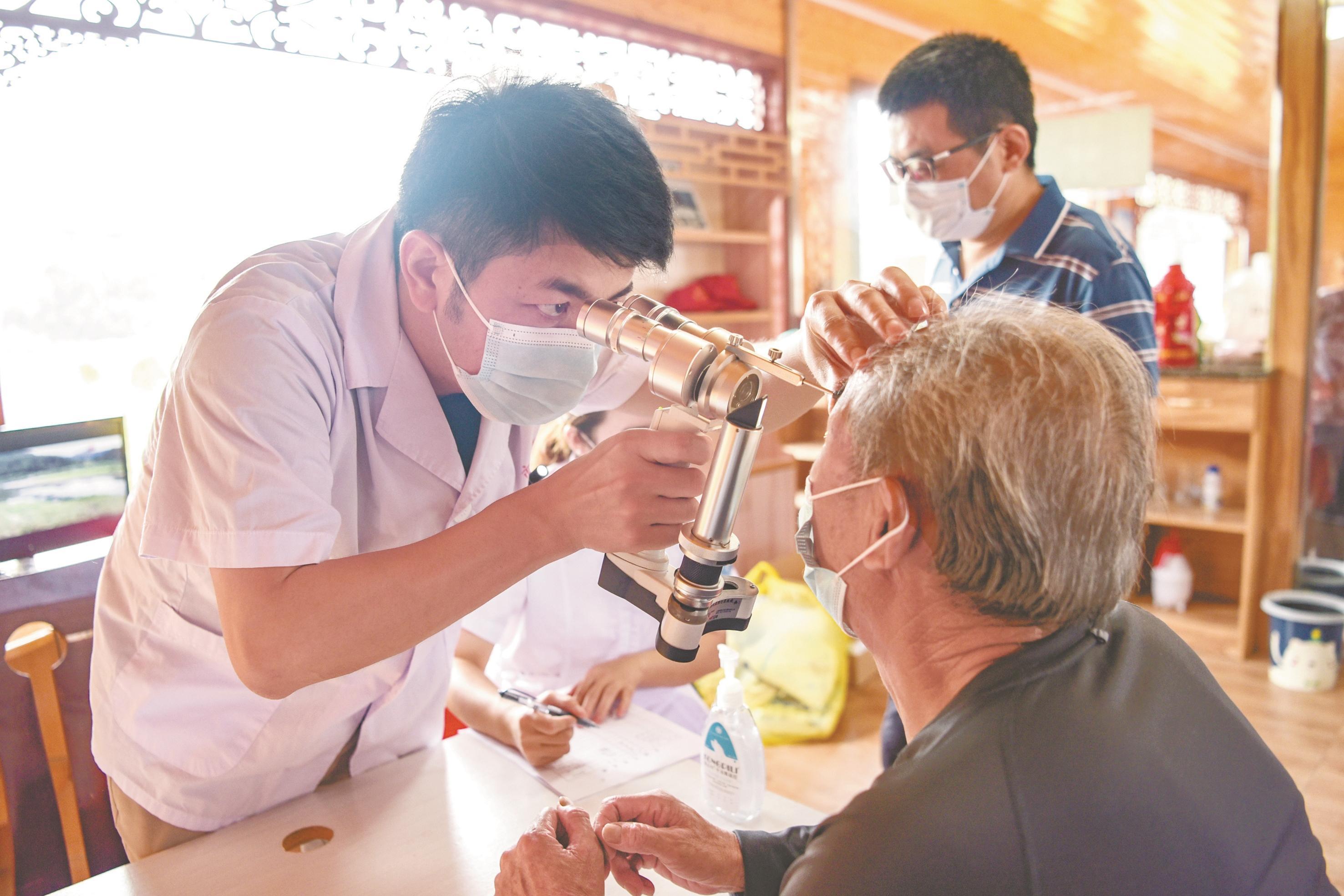 近日,安庆市第二人民医院的医护人员在岳西县菖蒲镇毛畈村为村民进行眼科检查。本报通讯员 王先国 摄