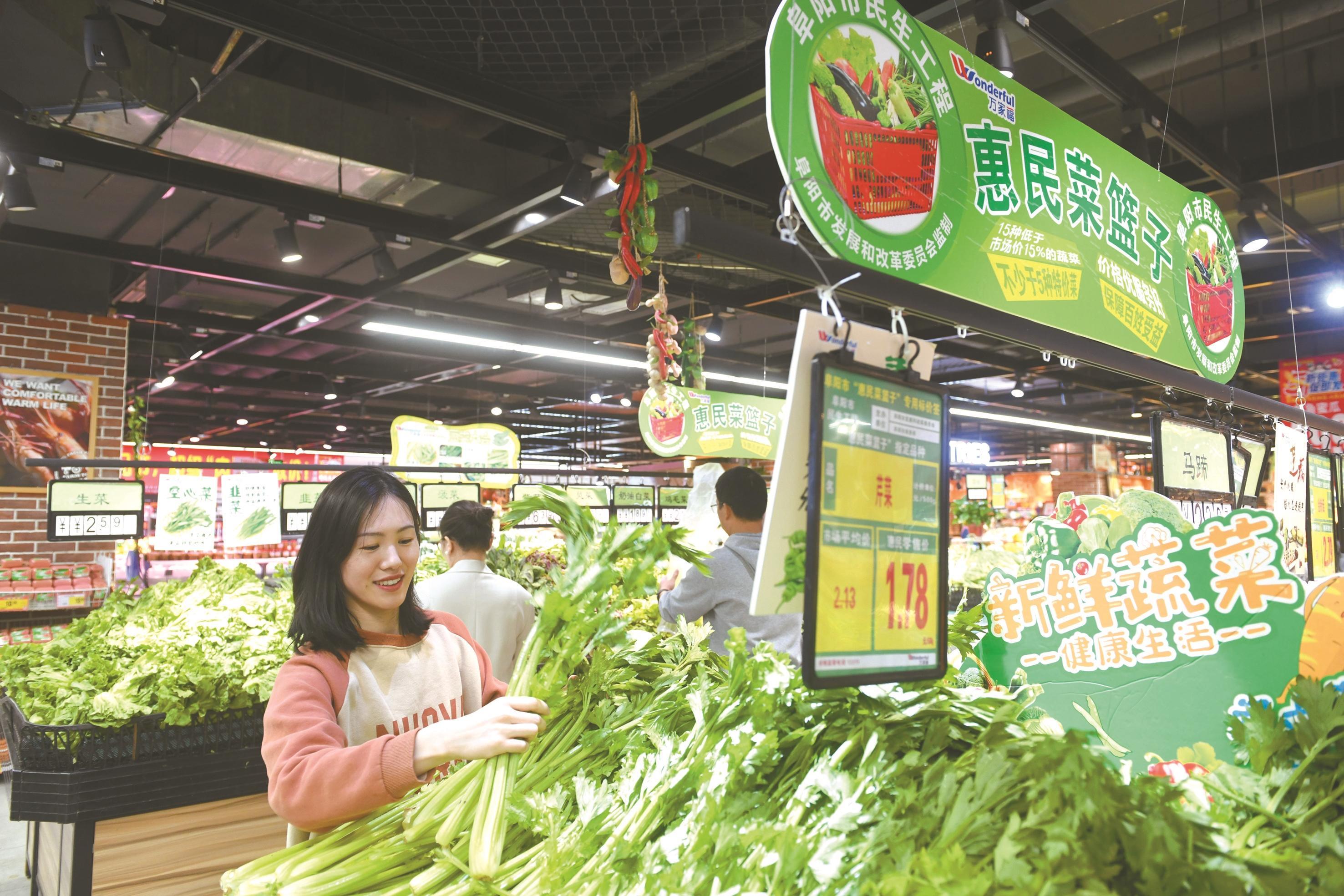 4月29日,阜阳市民在淮河路万家福超市设立的“惠民菜篮子”专区内选购新鲜蔬菜。“五一”假期,阜阳市启动 “惠民菜篮子”,涉及城区48家门店,惠民销售的农副产品品种不少于20个,其中蔬菜品种不少于15个。特约摄影 王 彪 摄