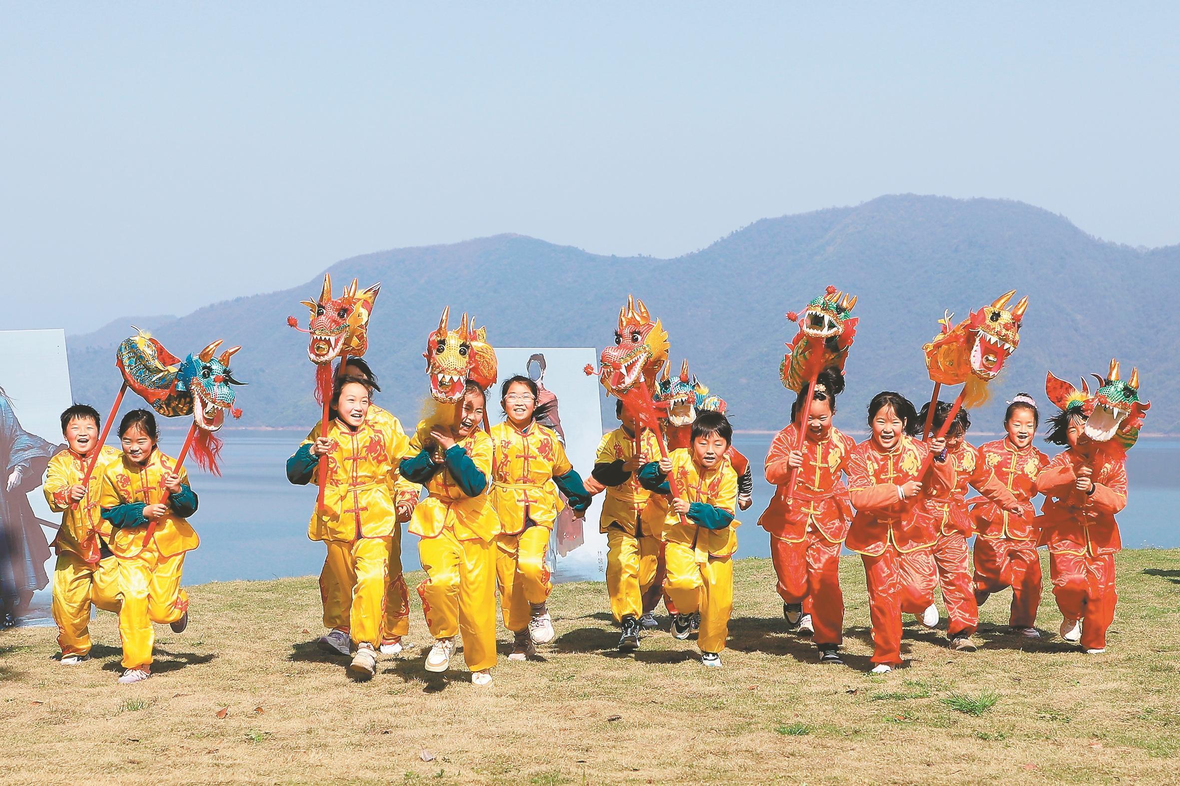 图为黄山市黄山区太平湖镇乡村复兴少年宫的小朋友们在太平湖畔表演非遗舞龙项目。本报通讯员 潘祯祥 摄