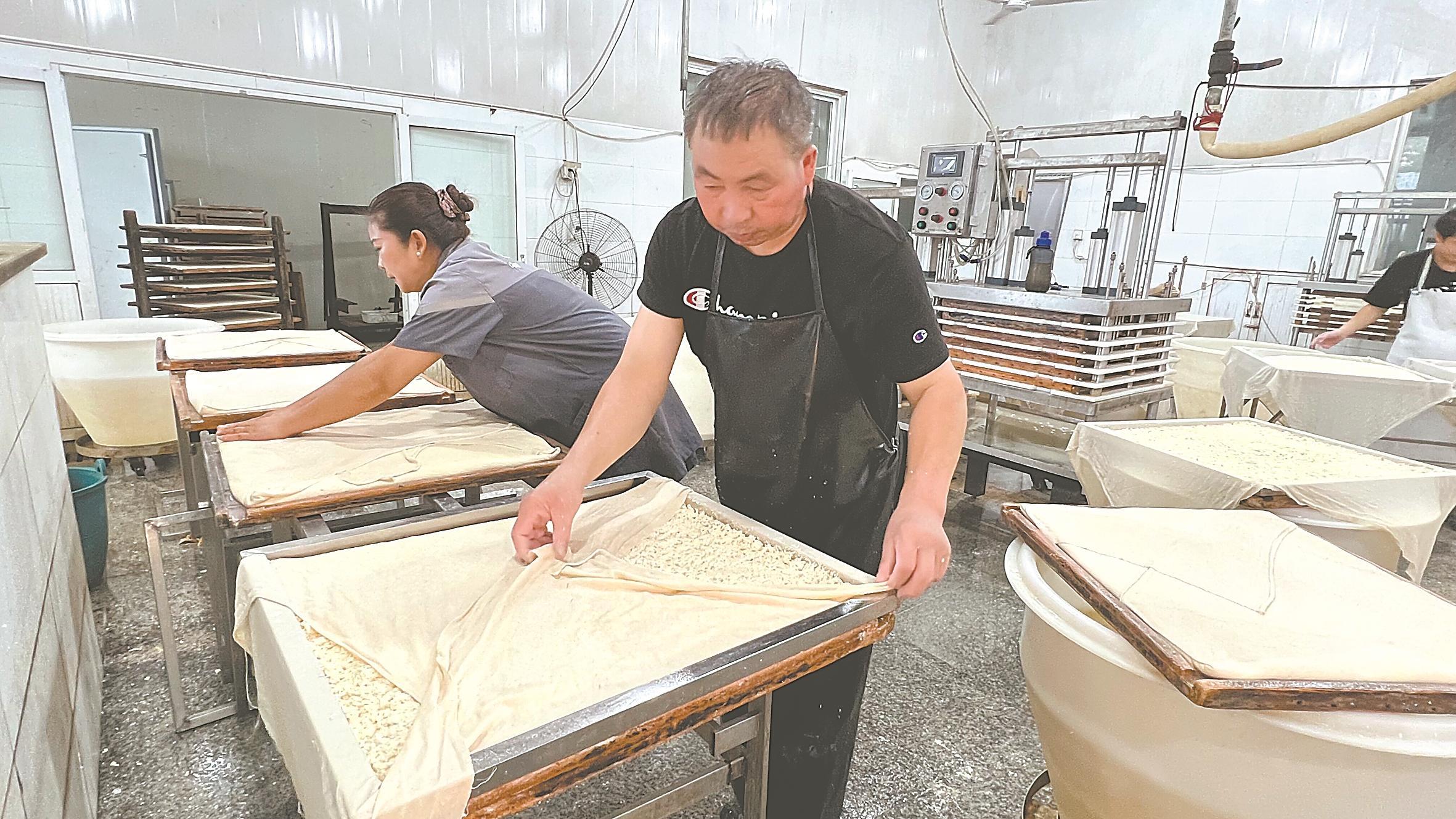 “黄豆泡发磨成豆浆后,要想形成豆腐,关键的一步就是点卤。”蒋光明介绍说,毛豆腐外层的绒毛按照绒毛的色泽和长度一般分为棉花毛、鼠毛、兔毛、蓑衣毛等,他家的毛豆腐之所以能够形成“蓑衣毛”,是因为在点卤的过程中使用了祖传的菌种。点卤之后,待豆腐成型,再进行撒盐、切块等步骤,之后就是耐心等待豆腐出毛了。