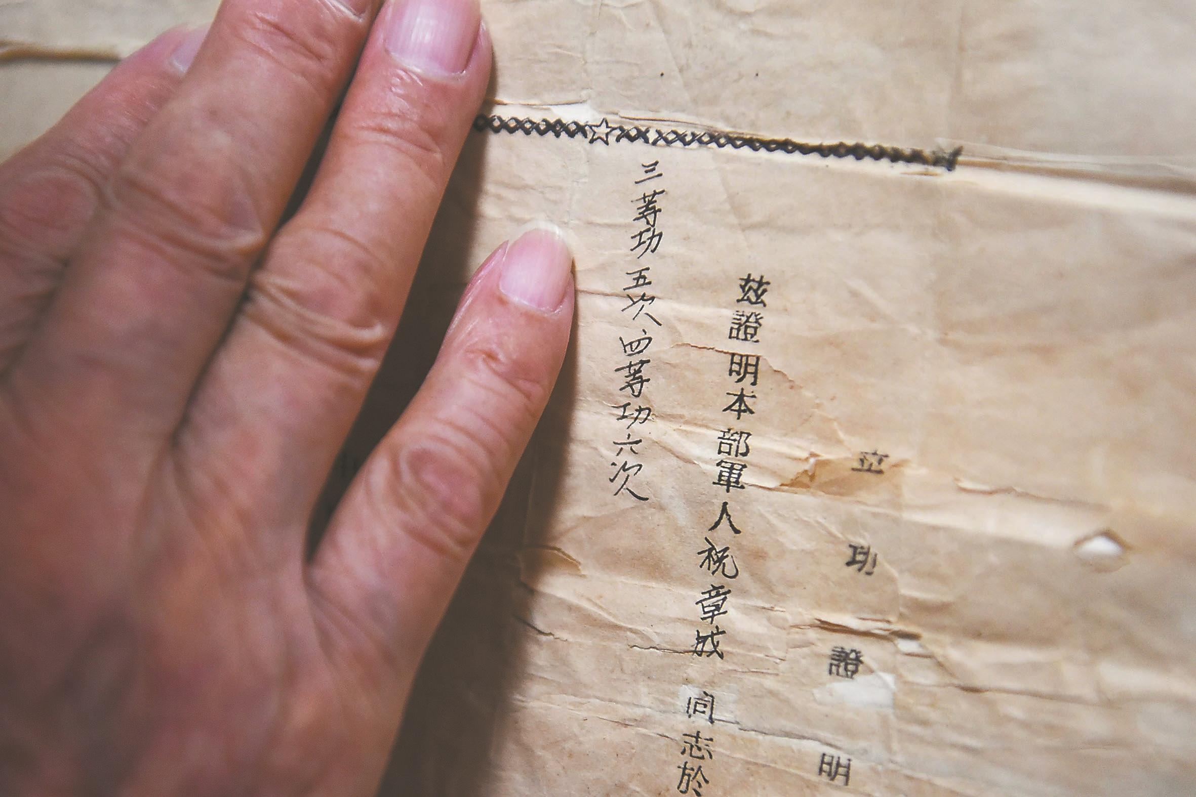 指着一张写有“共立三等功五次、四等功六次”发黄的立功证明信,祝章成告诉记者:“这上面的功劳不都是我本人的。”原来,1956年祝章成转业时,总共获得三等功三次、四等功一次,师政工科科长叮嘱道:“小祝,朝鲜战场上牺牲了那么多战友,他们也获了很多战功……我把他们的功劳都记在你的名下……你要记住他们!不要忘记他们!”