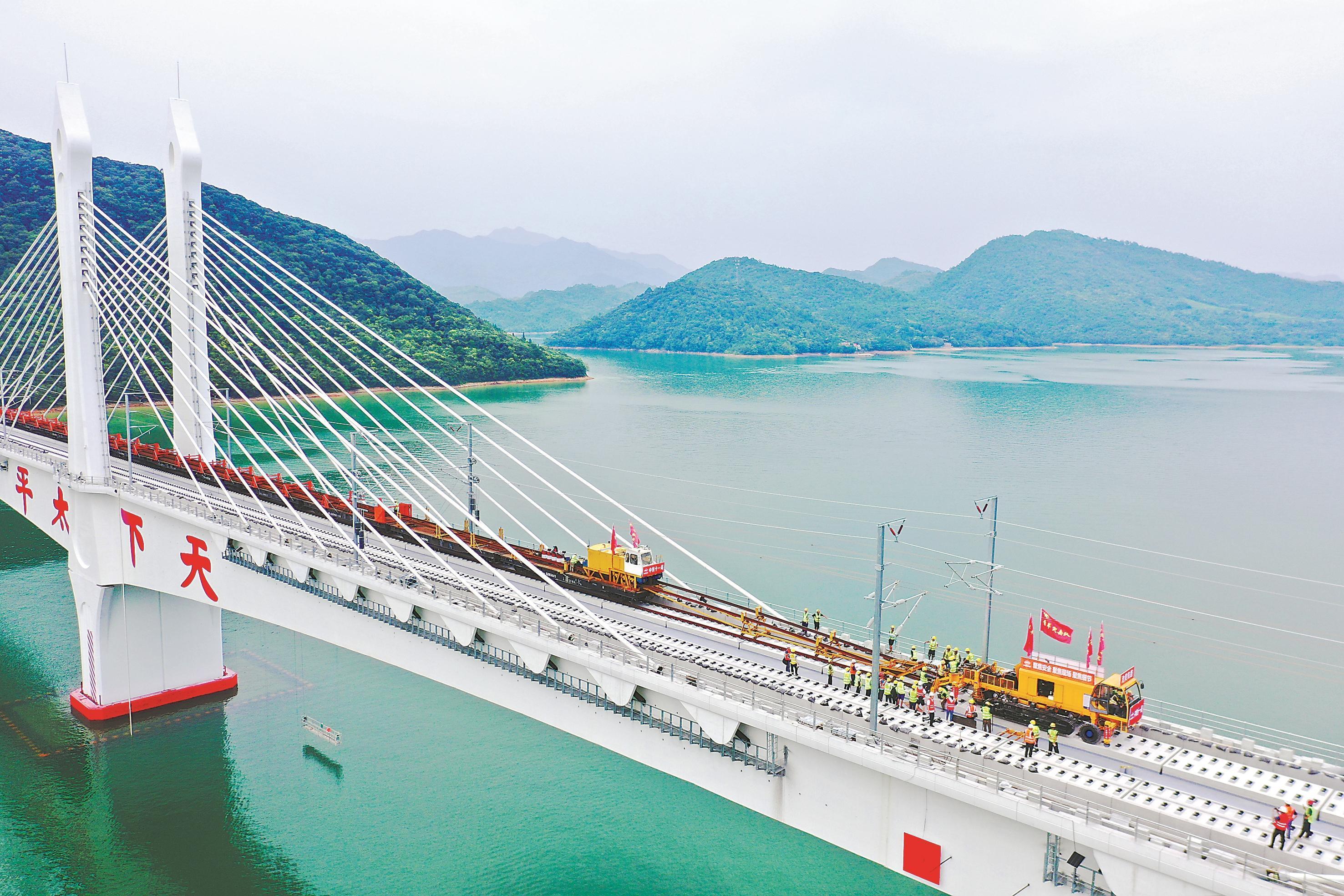 8月21日,在池黄高铁全线唯一控制性工程太平湖特大桥上,中铁十一局建设者操控着铺轨机组将一对500米长钢轨平稳地铺设在无砟轨道板上,标志着池黄高铁铺轨至太平湖特大桥。截至目前,池黄高铁正线铺轨已达105公里,约占总任务量的42%。 本报记者 许 昊 摄