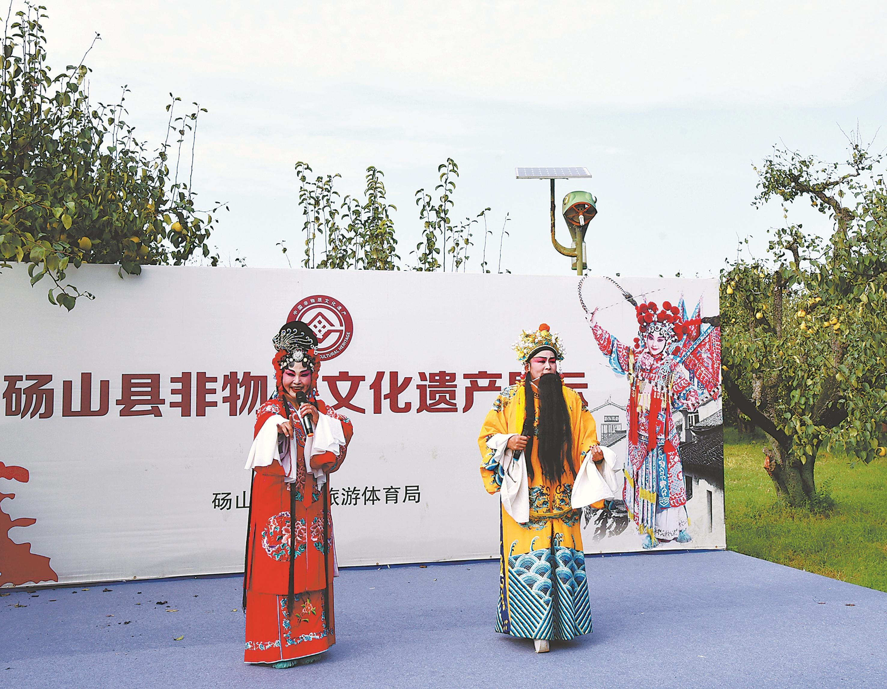 连日来,砀山县开展“非遗文化进梨园”活动,唢呐吹奏、砀山四平调演唱等国家级非遗节目,吸引省内外游客驻足观看。图为演员在该县良梨镇梨树王风景区表演戏曲。