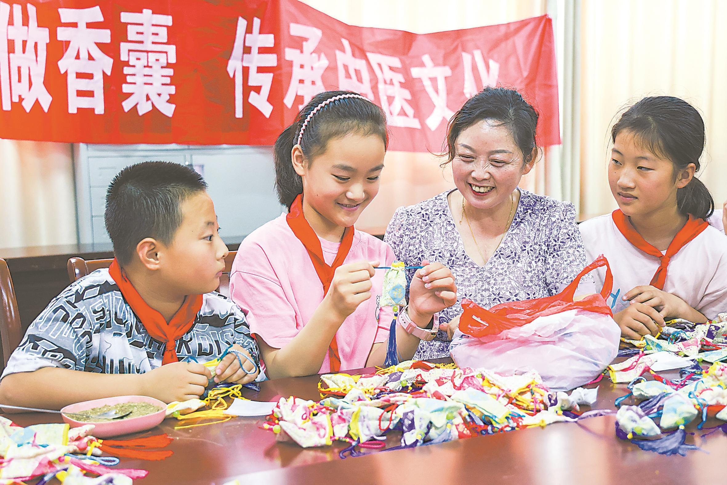 图为马鞍山好人钟闻清(中)走进含山县铜闸学校,开展“识草药 做香囊 传承中医文化”主题实践活动。(资料图片) 本报通讯员 张道平 齐盼盼 摄
