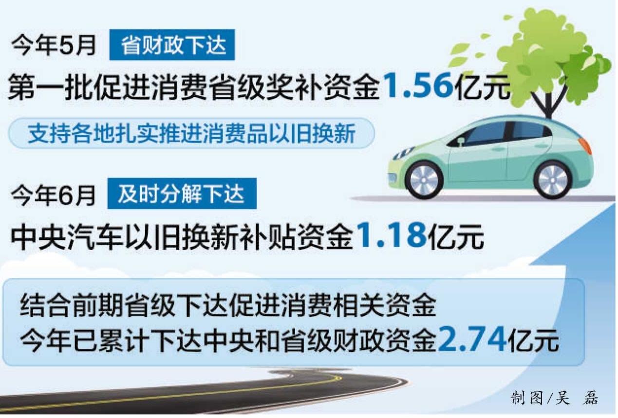 本网讯(记者 朱卓)今年以来,省财政厅积极完善实施促消费政策,扎实推进消费品以旧换新,进一步激发有潜能的消费。5月11日,省财政下达第一批促进消费省级奖补资金1.56亿元,支持各地扎实推进消费品以旧换新。6月11日及时分解下达中央汽车以旧换新补贴资金1.18亿元。结合前期省级下达促进消费相关资金,已累计下达中央和省级财政资金2.74亿元。