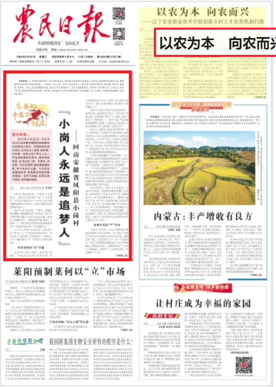 《农民日报》9月18日头版头条刊发《“小岗人永远是追梦人”——回访安徽省凤阳县小岗村》,为系列报道“总书记牵挂的村庄”第一篇,从农业常改常新、产业多面开花等方面,介绍了凤阳县小岗村发展现代化农业产业的一系列实践,生动、全面地展现了小岗的巨大变化。9月19日头版头条刊发《安徽高质量建设徽风皖韵和美乡村》,关注作为农业大省的安徽,深入学习运用“千万工程”蕴含的发展理念、工作方法和推进机制,高起点谋划、高规格推进、高标准建设彰显徽风皖韵的宜居宜业和美乡村。