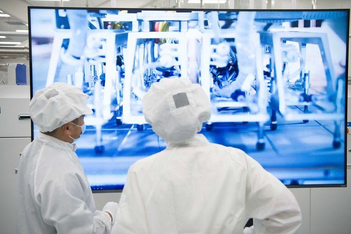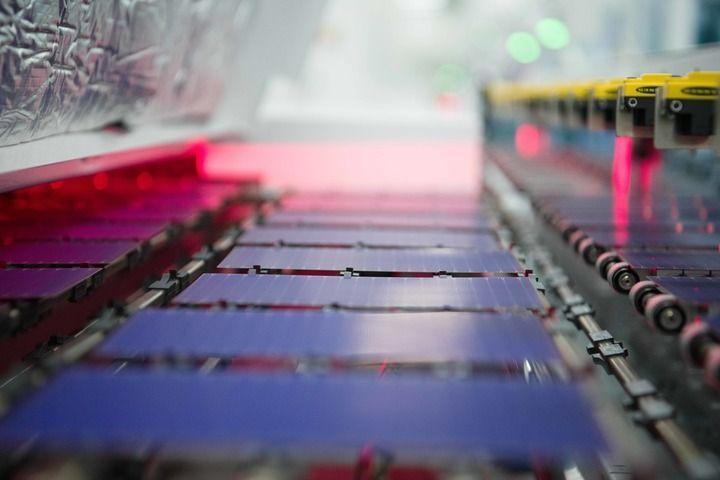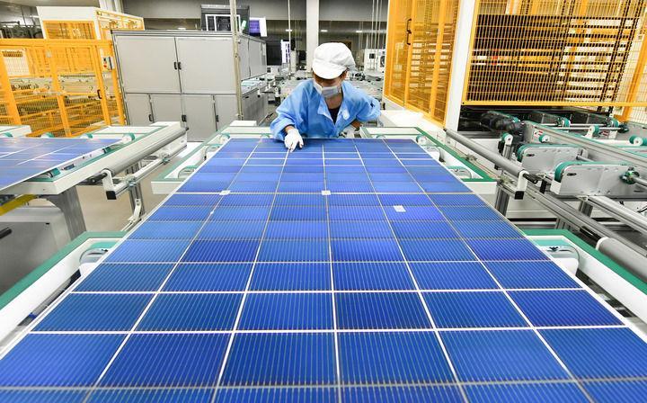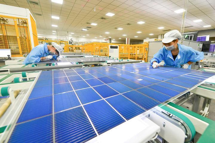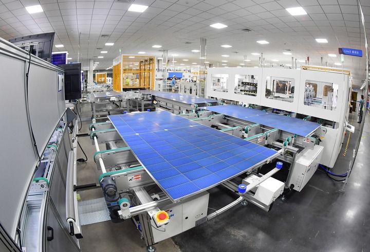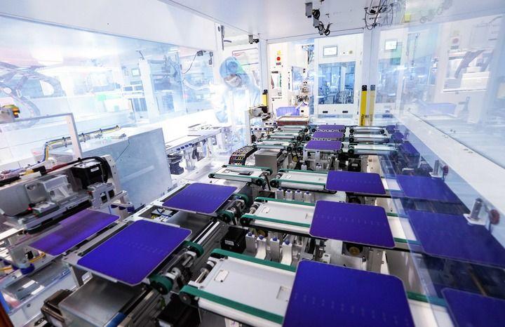 安徽合肥,全球单体产能最大的异质结光伏电池及组件一体化工厂,工业机器人将一个个硅片投送到一架白色机器的腔体,经过绵延的智能化流水线,状如手机大小、薄如纸片的光伏电池片便下线了。
