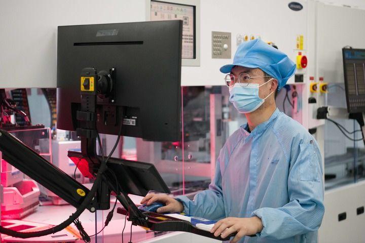 8月20日,在安徽华晟新能源科技股份有限公司的异质结光伏电池及组件工厂内,工作人员在查看智能化产线运行情况。新华社记者 张端 摄