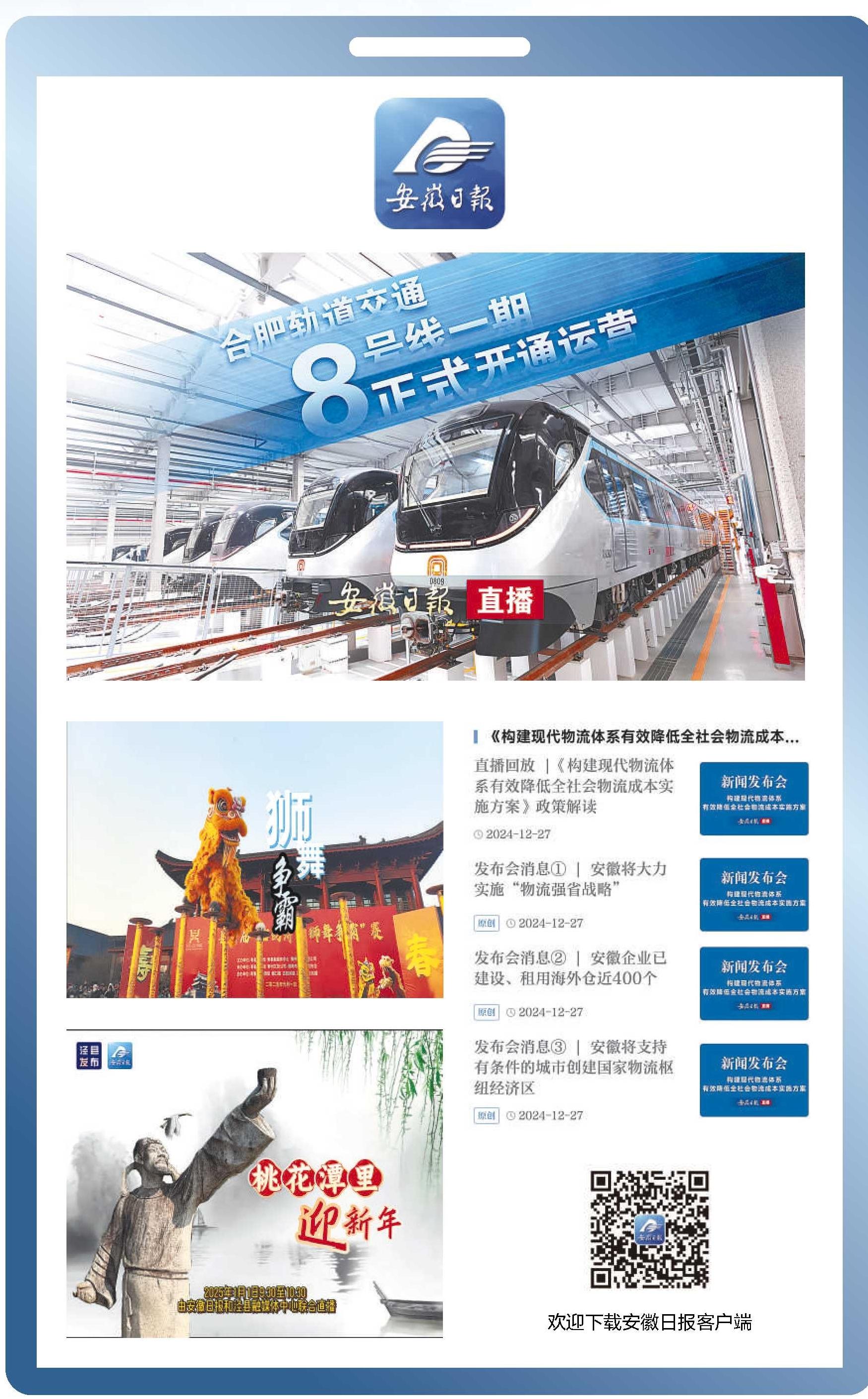 2024年12月27日,安徽日报客户端以直播频道和首页“直播快讯”的形式,滚动报道正在直播的省政府《构建现代物流体系有效降低全社会物流成本实施方案》政策解读新闻发布会,“安徽将大力实施‘物流强省战略’”“安徽将支持有条件的城市创建国家物流枢纽经济区”……一条条直播快讯伴随新闻发布会直播同步推出,受到广大网友的高度关注和转发。
