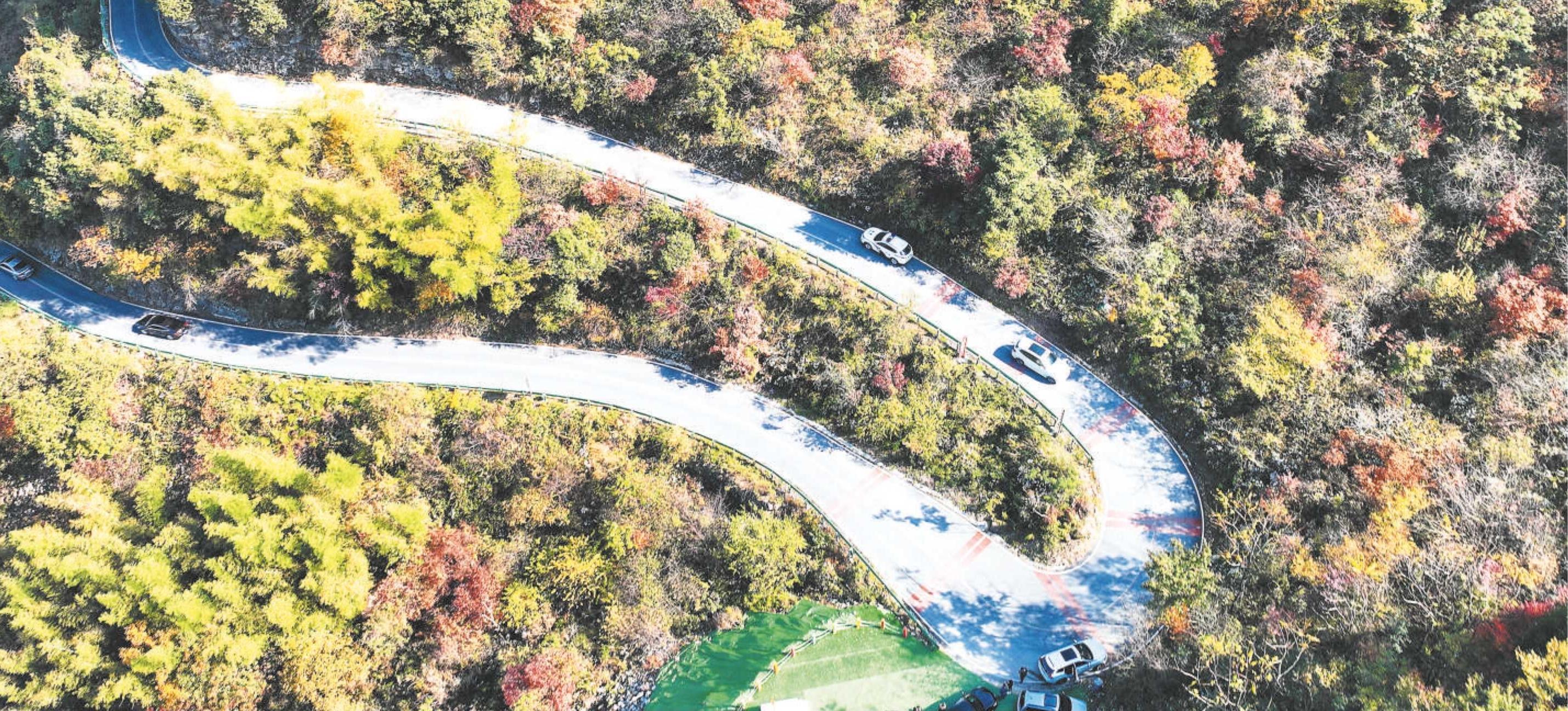 皖南“川藏线”泾县桃岭公路“六道弯”,漫山遍野斑斓色彩,吸引众多游客体验“网红天路”的险峻和幽美。(资料图片)本报记者 李博 摄