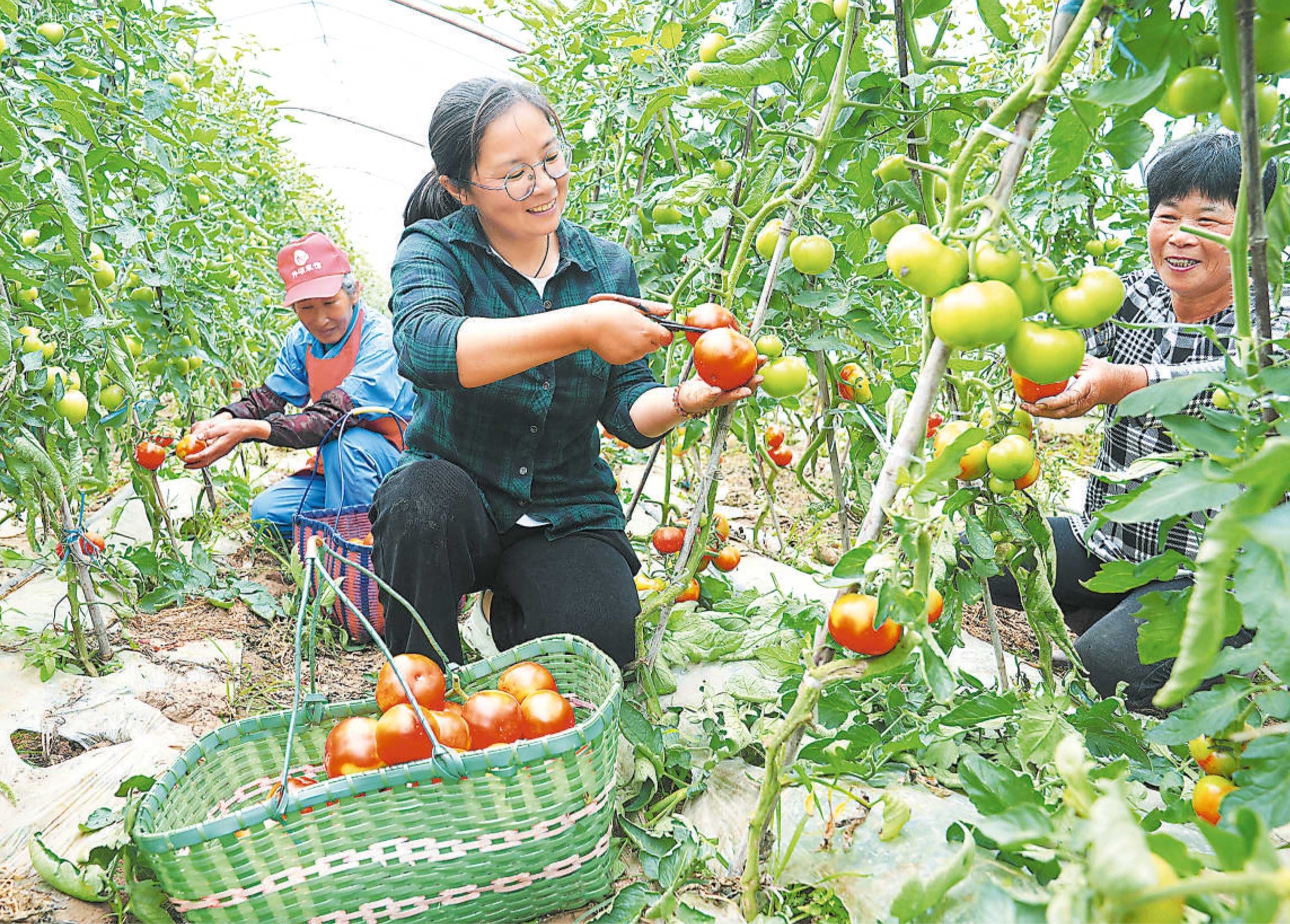 4月26日,安徽省劳动模范、枞阳县青园心家庭农场负责人余青青(中)在采摘西红柿。2014年,余青青回到枞阳县枞阳镇新丰村,流转380多亩土地种植蔬菜,种植基地产出各类蔬菜1200吨,产值450多万元,带动100多个村民就业。王章志 摄