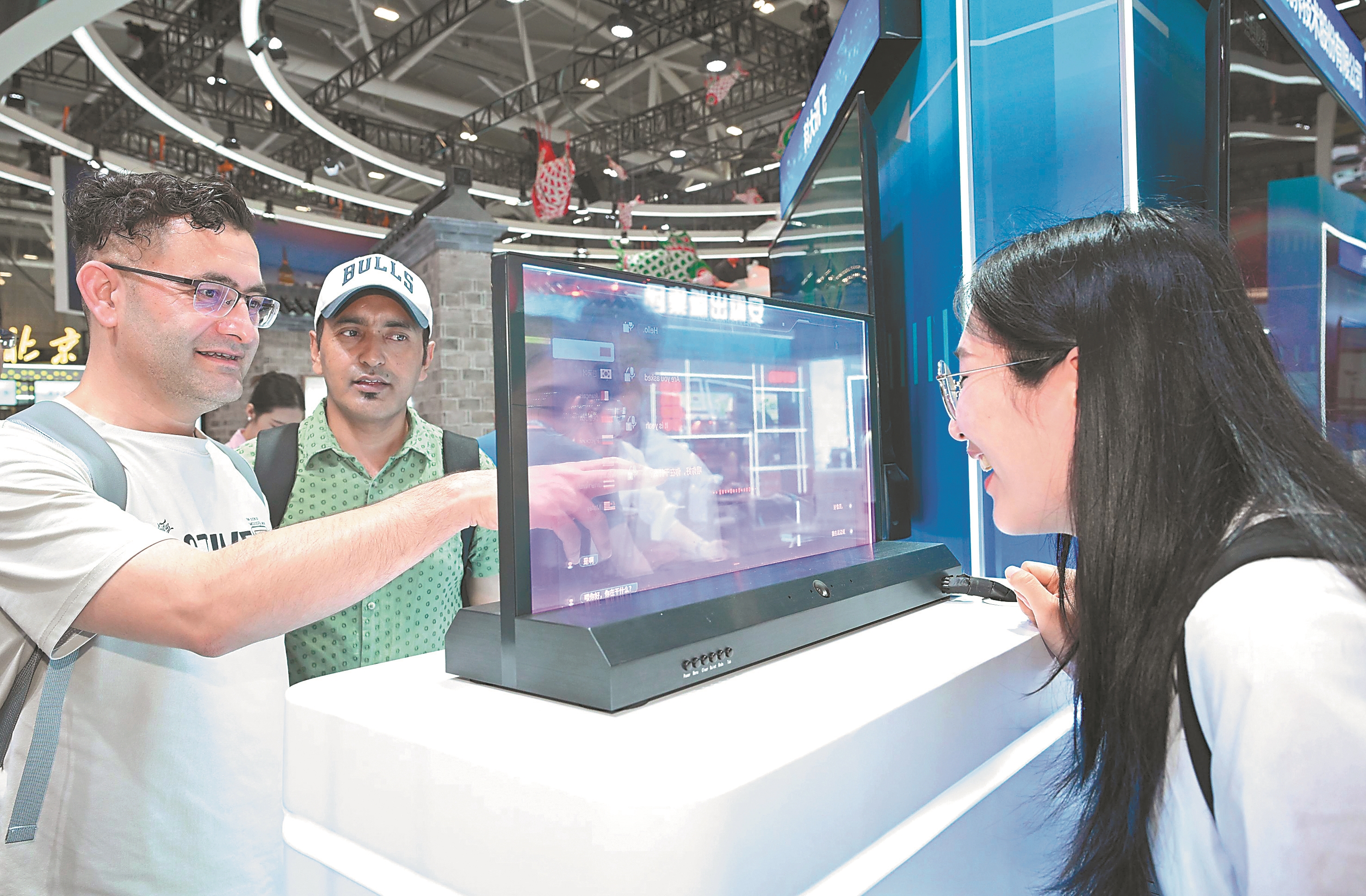 5月22日,外国友人在深圳文博会安徽文化产业综合馆,通过科大讯飞多语种AI透明屏进行无障碍交流。本报记者 张大岗 摄