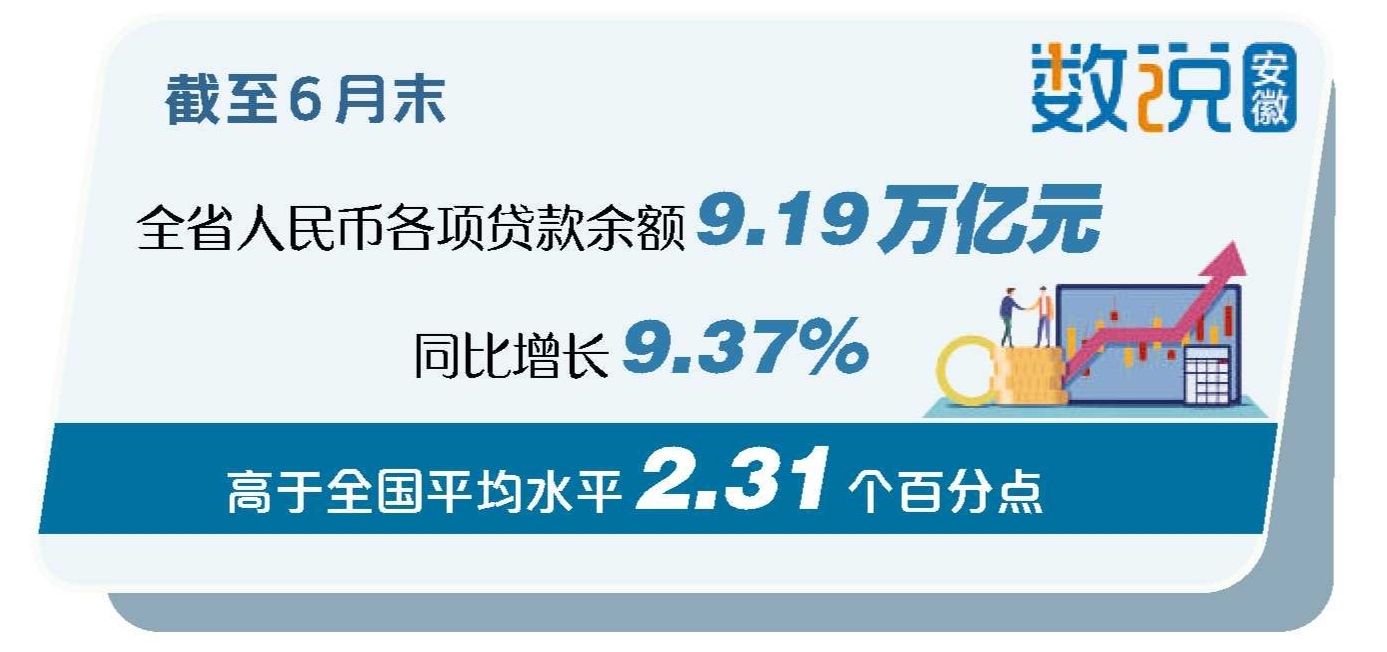 本网讯(记者 何珂)7月25日,记者从中国人民银行安徽省分行获悉,截至6月末,全省人民币各项贷款余额9.19万亿元,同比增长9.37%,高于全国平均水平2.31个百分点,较年初增加5896.90亿元。