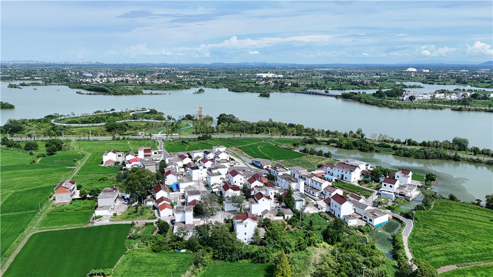 8月6日,南陵县许镇镇,村庄与奎湖相映成景,构成一幅美丽的田园画卷。