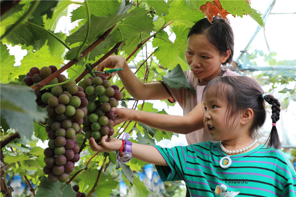 8月6日,游客在南陵县许镇镇马元村火金葡萄采摘园采摘葡萄。