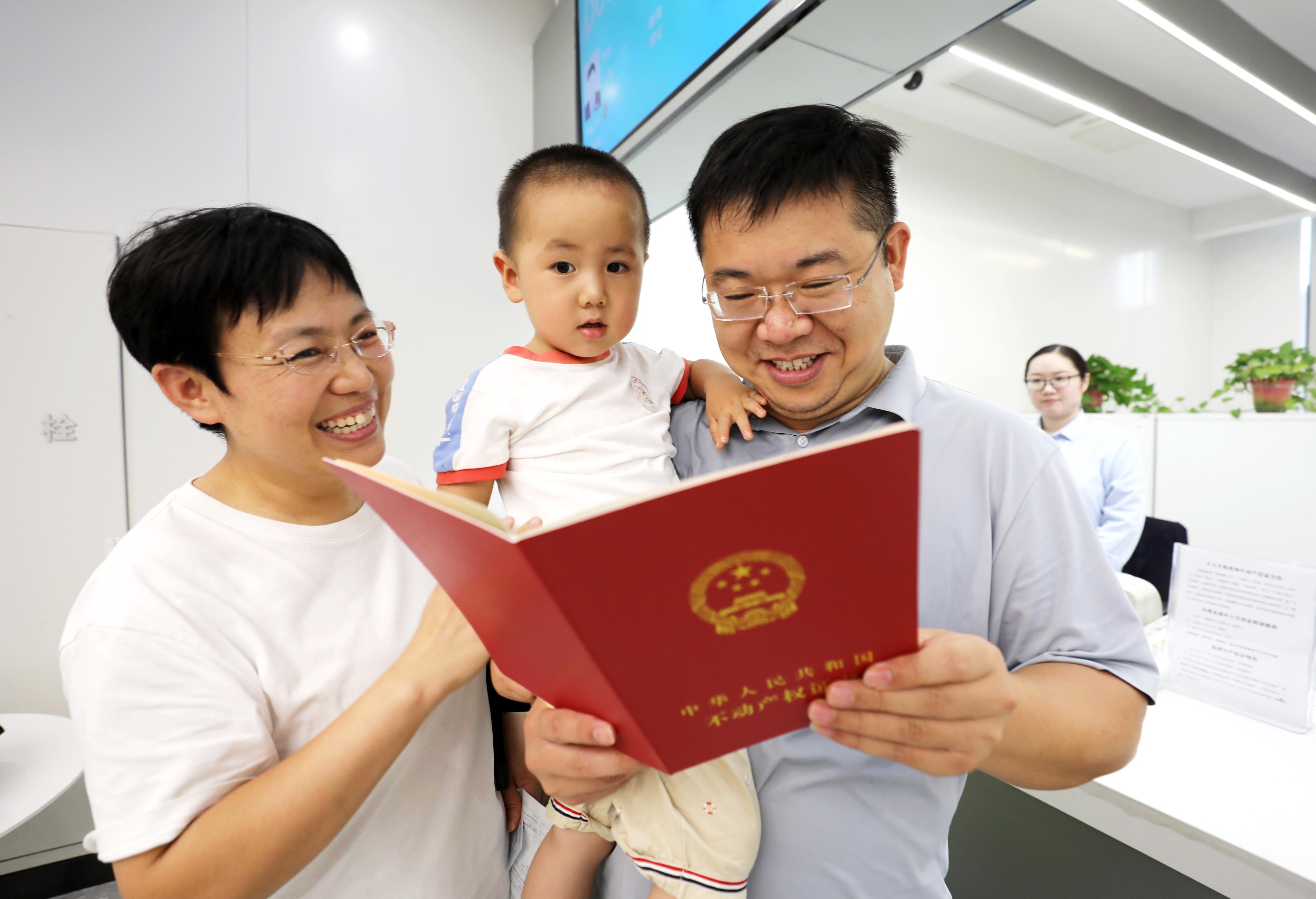 8月15日,在淮北市相山区政务中心不动产登记入学“绿色通道”,为孩子报名的陈先生一家拿到了刚刚办理的产权证书。本报通讯员 李鑫 摄