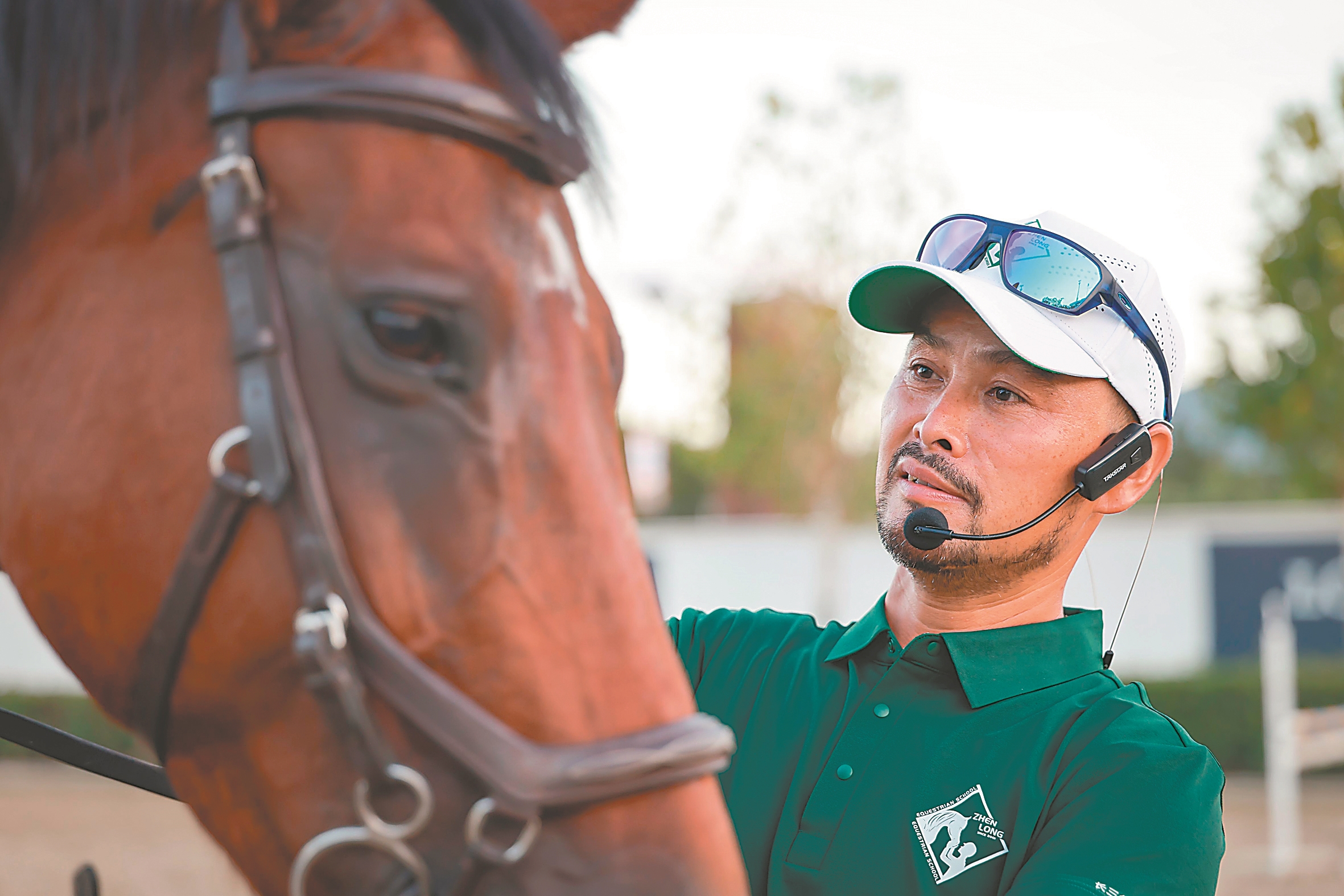 8月28日傍晚,广德国际马术赛事中心训练场,陈阵在训练后与马匹交流。