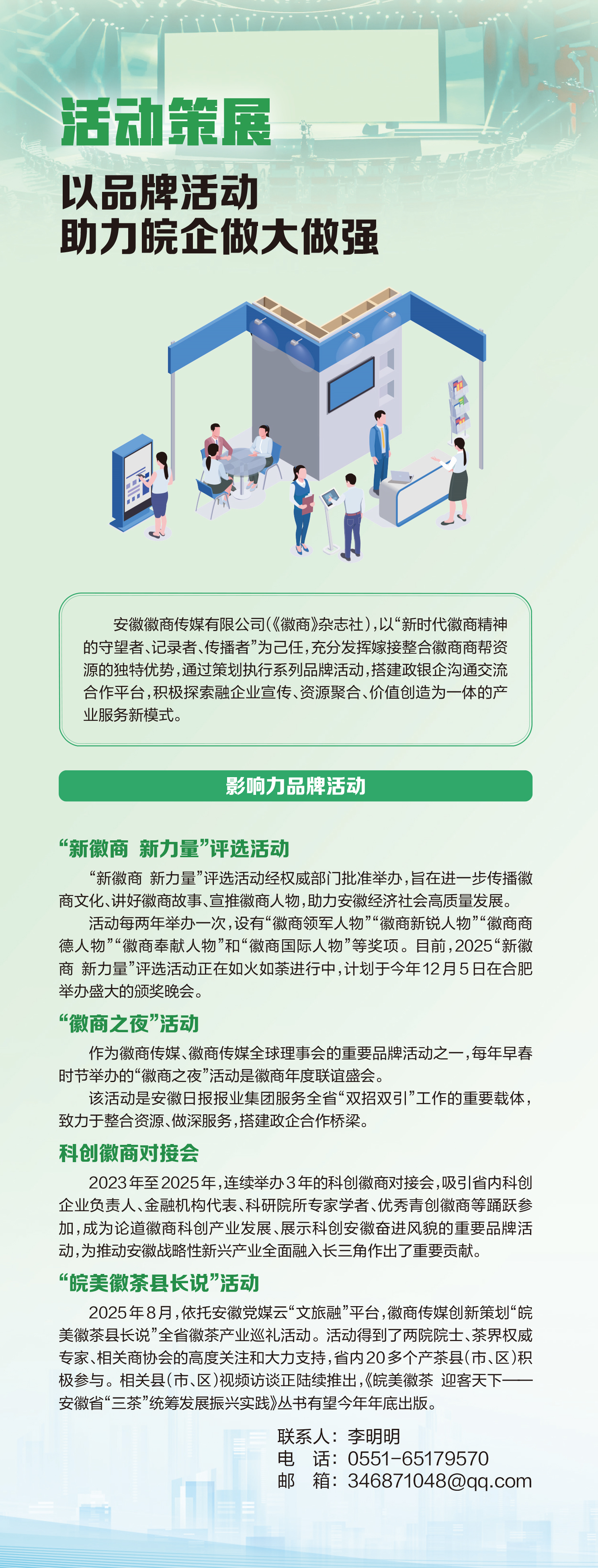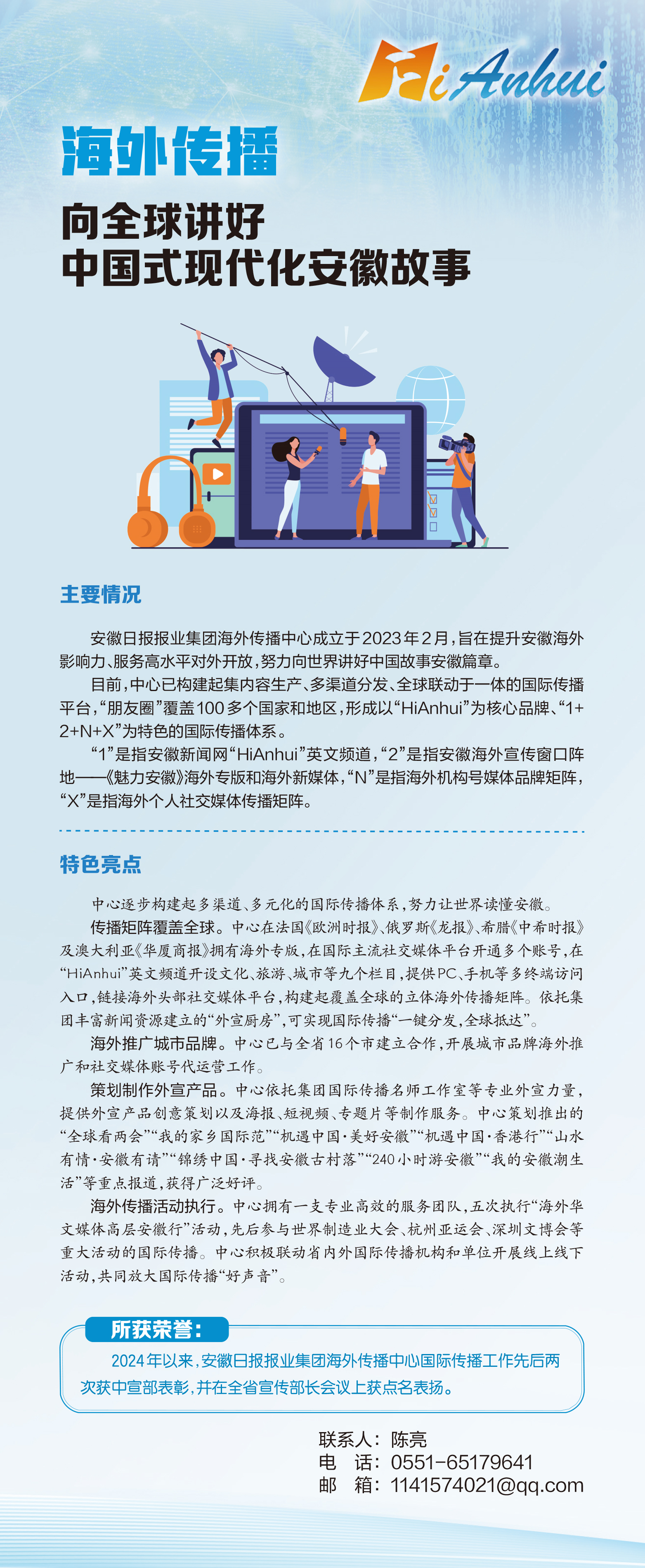 此次发布的“双招双引”项目包括广告位招商、品牌授权及文创产品开发、技术应用合作开发、新媒体新业态合作开发、地产合作开发和租赁运营、人才柔性引进、活动共办协办、教育培训合作、海外传播合作9大类,力求以平台思维集聚优质资源,以用户思维打造数智服务,以融合思维发展新型业态。招商引资项目中,既有“强省品牌计划”“安徽时评”“江淮观察”“安徽党媒云”“小叶医探”等新媒体品牌的运营合作,又有生成式人工智能创新应用、微短剧创作运营、“徽商甄选”直播带货等新型文化业态合作。招才引智项目聚焦急需紧缺人才,面向全社会选聘集团投资运营与产业发展咨询委员会外部委员、名师工作室导师、人工智能训练师以及安徽日报教育培训中心总经理等。