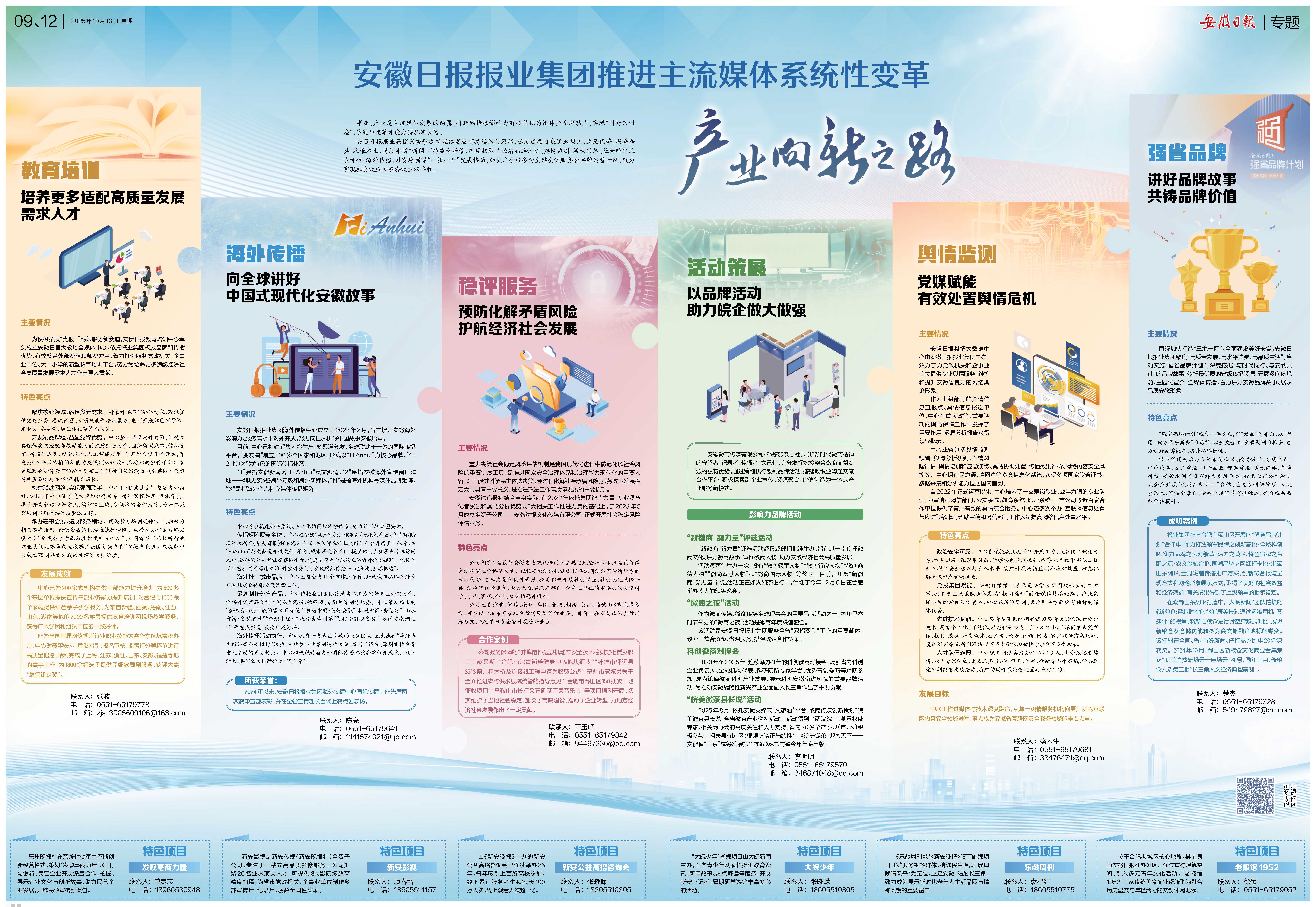 在推进系统性变革过程中,安徽日报报业集团围绕形成新媒体发展可持续盈利闭环、稳定成熟自我造血模式,立足优势、深耕垂类、扎根本土,持续丰富“新闻+”功能和场景,巩固拓展了强省品牌计划、舆情监测、活动策展、社会稳定风险评估、海外传播、教育培训等“一报一业”发展格局。