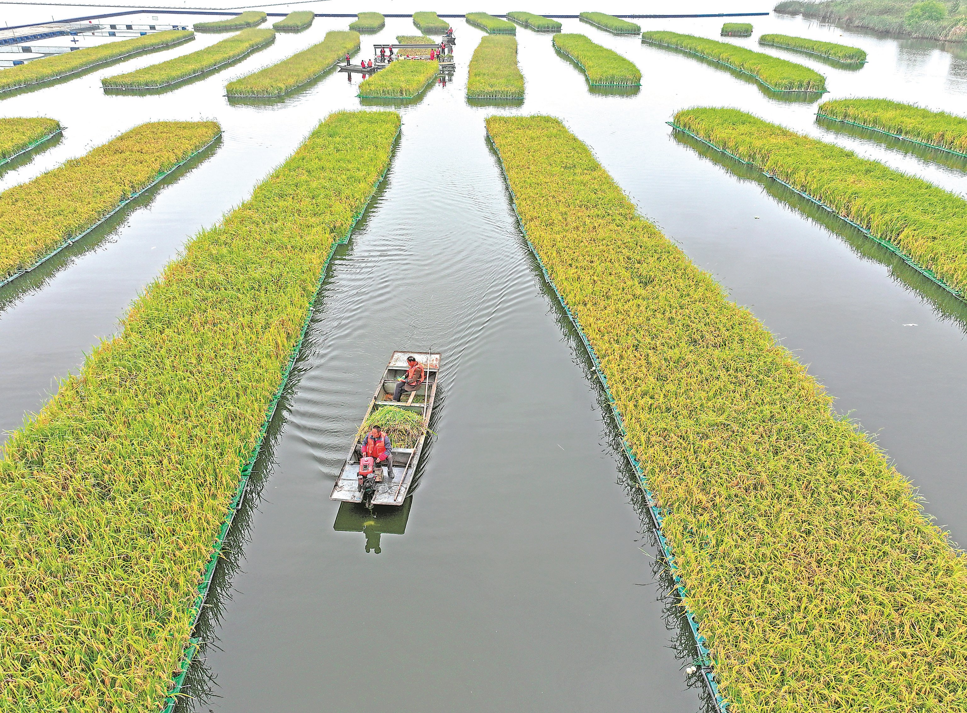 10月14日,工人在淮南市凤台县顾桥镇采煤沉陷区水面上收获漂浮式水稻(无人机照片)。 新华社发(陈彬 摄)