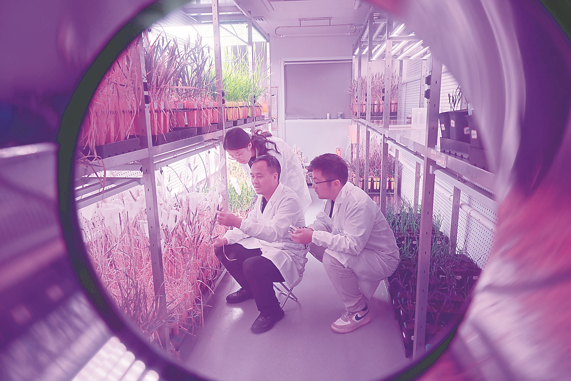 10月10日,在中科合肥智能育种加速器创新研究院,智能机械研究所副研究员汤才国(中)与研究人员在加代舱内查看作物生长情况。加代舱通过精准调控光温水肥气等参数,作物生长周期大幅缩短。小麦传统一年种1代,在舱里一年能繁育4代至6代。