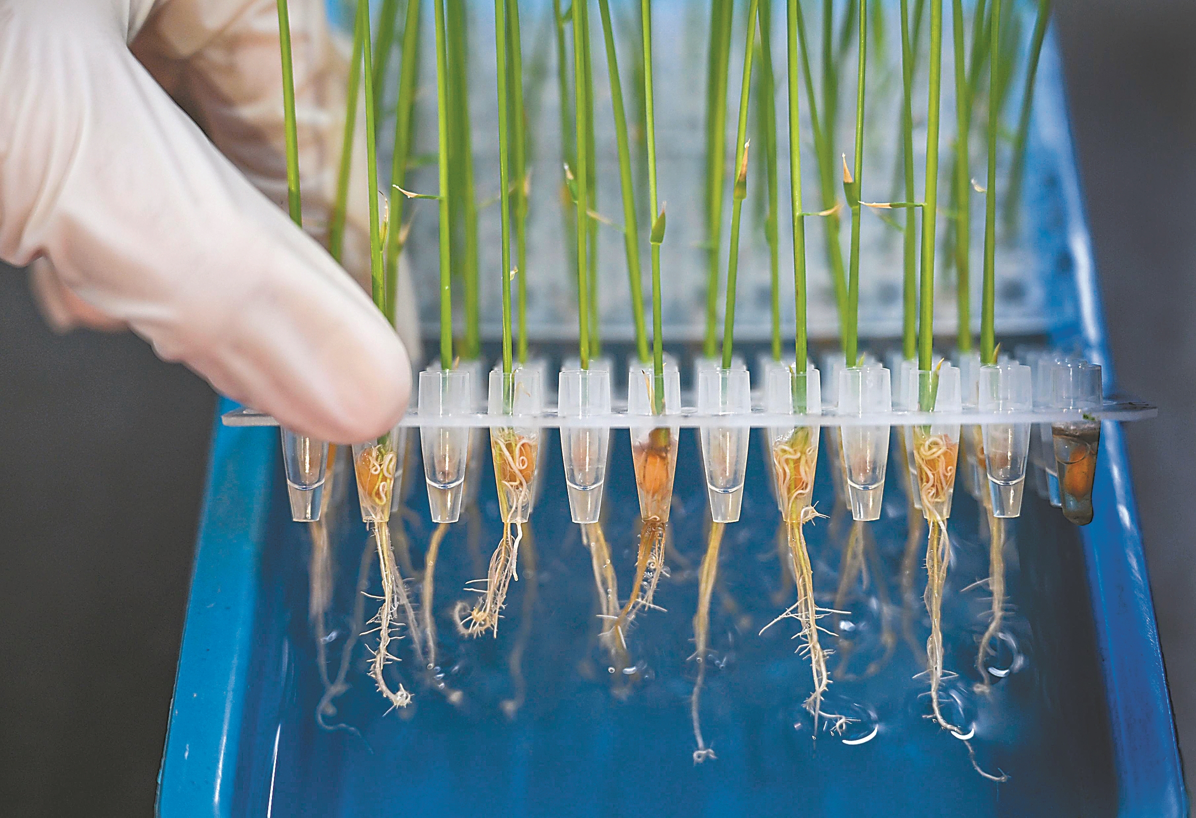 10月9日,在中国科学院合肥物质科学研究院智能所实验室,科研人员正在观察水稻水培幼苗根系长势。
