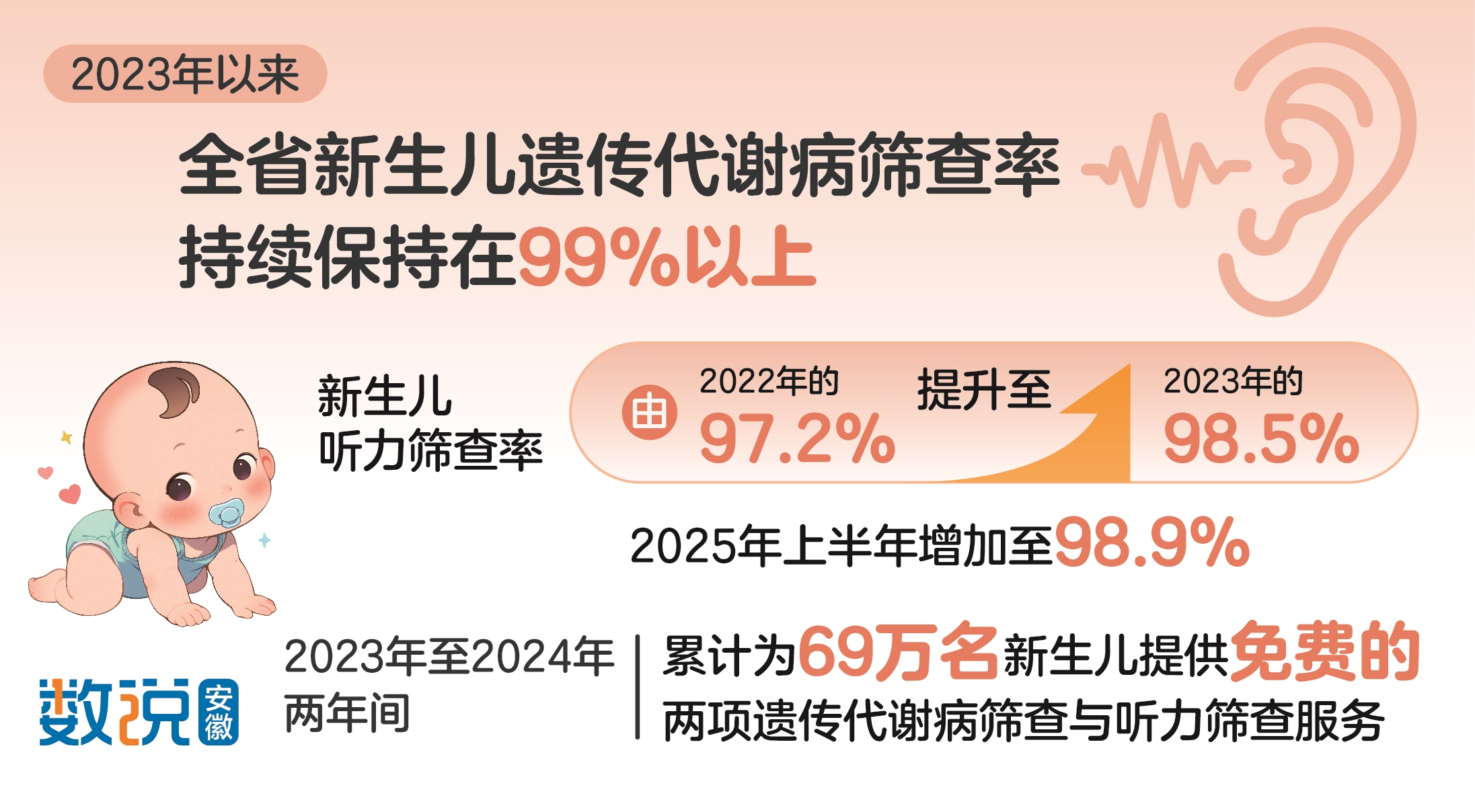 据悉,自2023年该项目纳入民生实事以来,全省新生儿遗传代谢病筛查率持续保持在99%以上;新生儿听力筛查率由2022年的97.2%提升至2023年的98.5%,2025年上半年提升至98.9%,已提前实现《“健康中国2030”规划纲要》相关目标(遗传代谢病筛查率达98%、听力筛查率达95%)。2023年至2024年两年间,累计为69万名新生儿提供免费的两项遗传代谢病筛查与听力筛查服务。