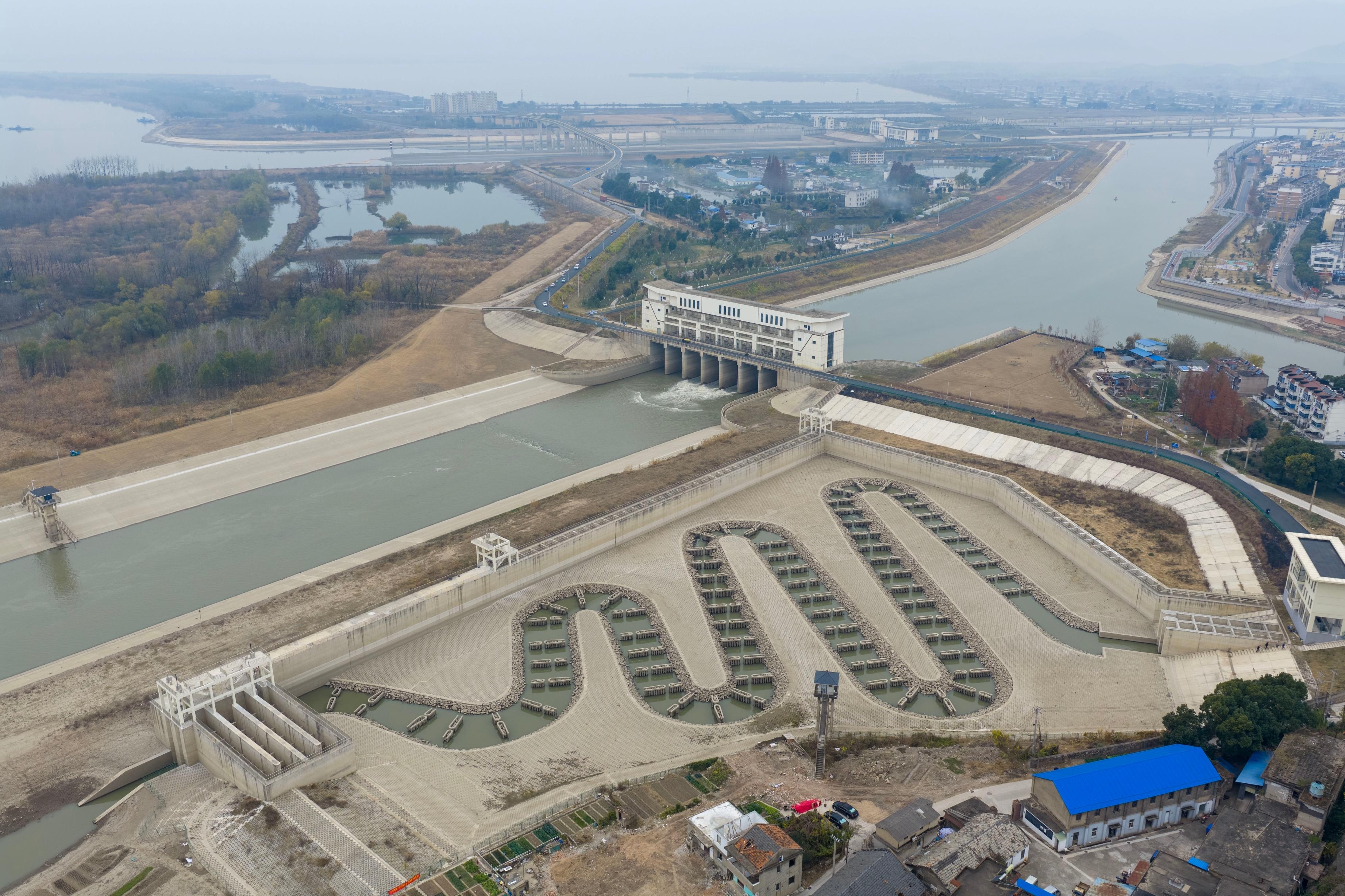 枞阳引江枢纽是引江济淮菜子湖线渠首引江枢纽,建设的入江和入湖双向鱼道是长江首个“双通道”鱼道,用以保障鱼类在长江和菜子湖之间洄游。
