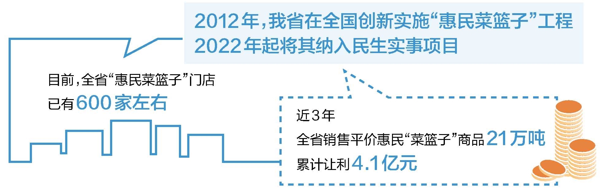 2012年,我省在全国创新实施“惠民菜篮子”工程,2022年起将其纳入民生实事项目。目前全省“惠民菜篮子”门店已有600家左右,在各市城区主要社区基本实现“全覆盖”。近3年全省销售平价惠民“菜篮子”商品21万吨,累计让利达4.1亿元。在主要节假日、突发事件及菜价上涨时,“惠民菜篮子”总会如约而至,为群众带来“稳稳的幸福”。
