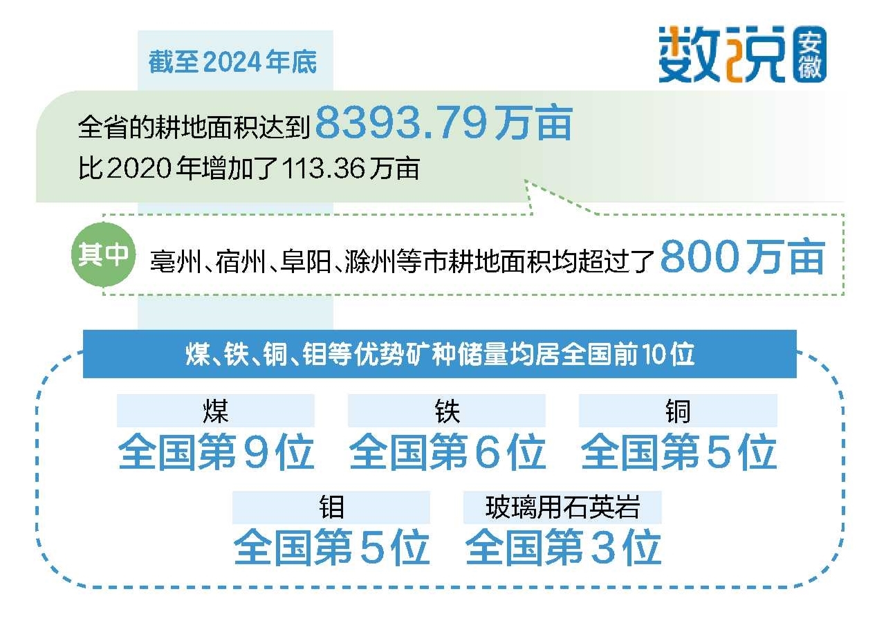 深入开展调查监测,自然资源家底更清。“十四五”期间,我省持续开展了土地、矿产、森林等自然资源的调查监测,动态掌握了各类资源的状况。截至2024年底,全省的耕地面积达到8393.79万亩,比2020年增加了113.36万亩,其中,亳州、宿州、阜阳、滁州等市耕地面积均超过了800万亩。煤、铁、铜、钼等优势矿种储量均居全国前10位,其中煤全国第9位、铁全国第6位、铜全国第5位、钼全国第5位、玻璃用石英岩全国第3位。全省林地、草地、湿地面积分别达到6037.52万亩、85.37万亩、57.80万亩。