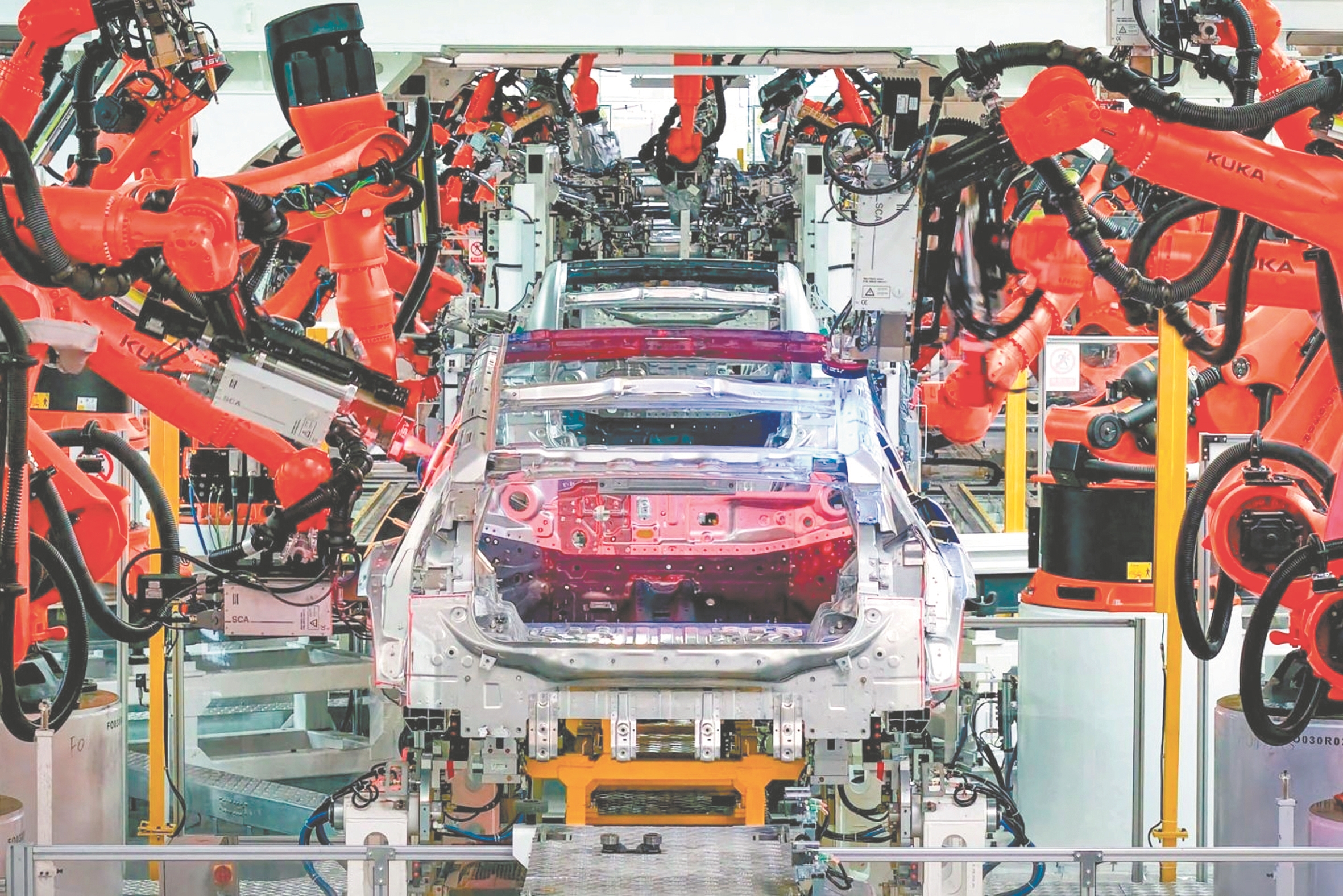 2025年9月,在合肥尊界超级工厂,机械臂正在焊接汽车车架。