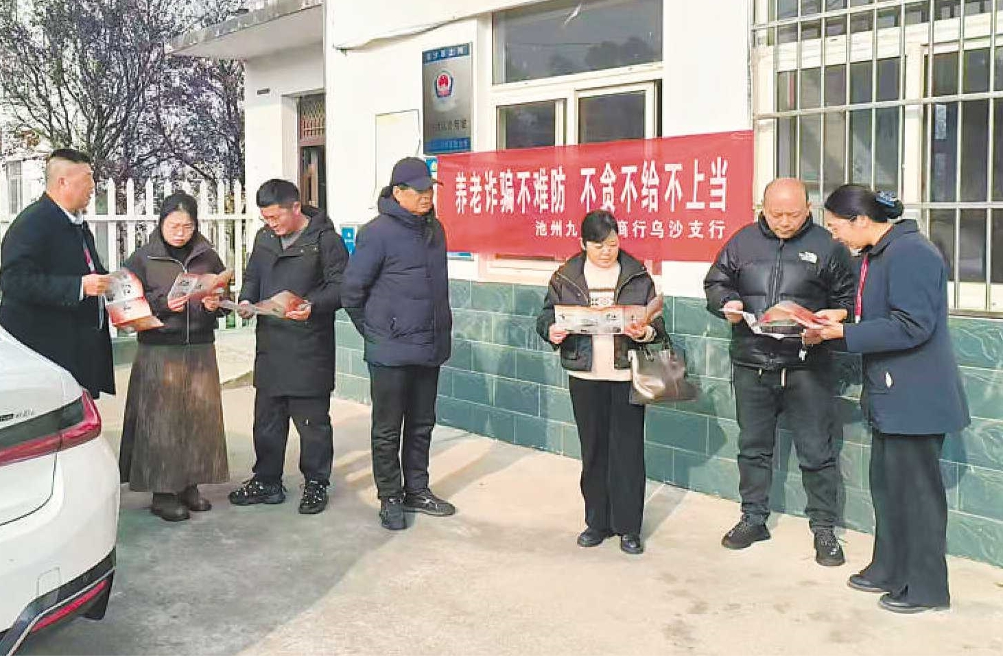 池州九华农商银行员工向返乡务工人员发放反电诈宣传折页。程丽丽 摄